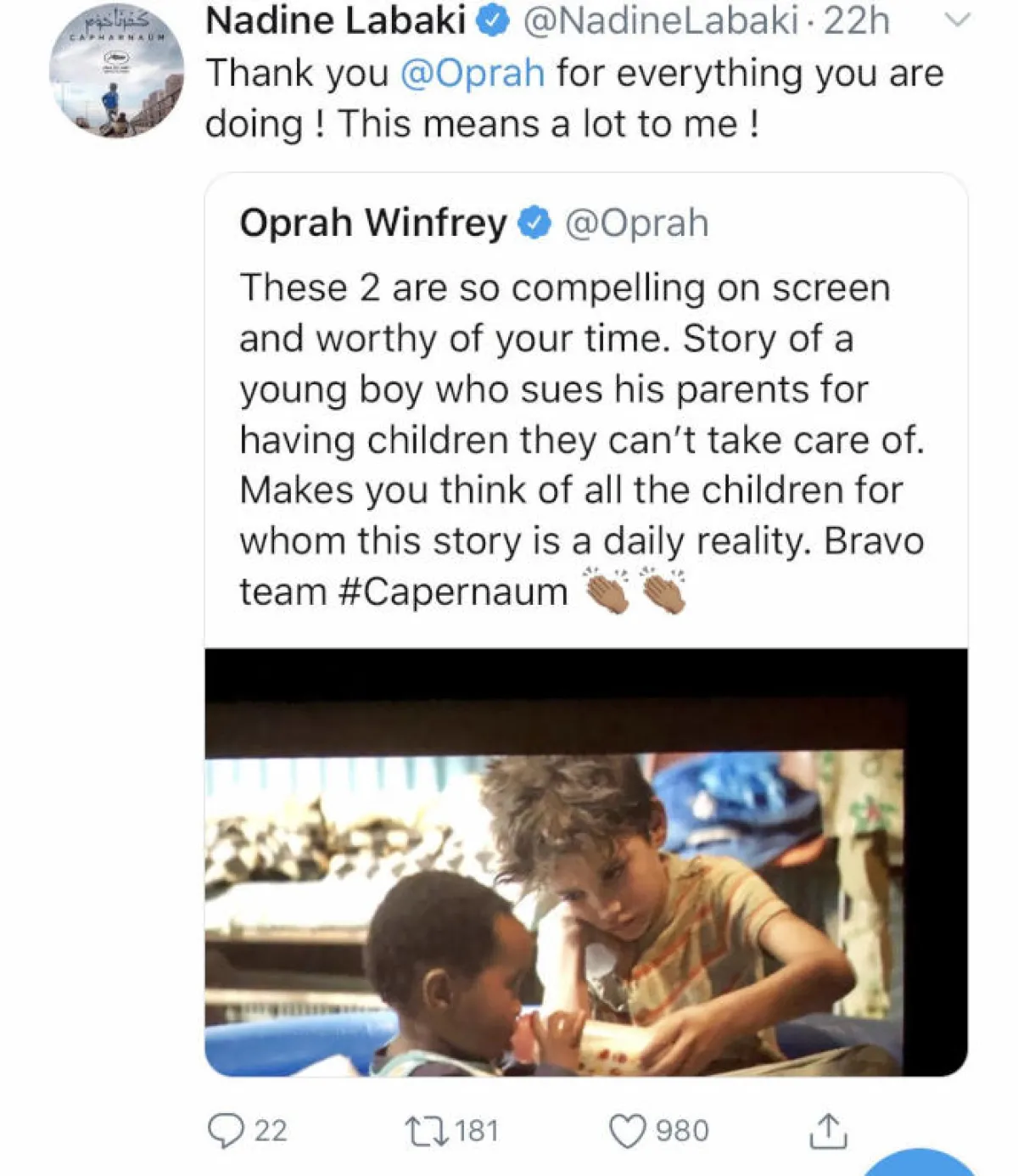 غردت الإعلامية الأمريكية الشهيرة أوبرا وينفري Oprah Winfrey ببعض كلمات أشبه بجائزة عالمية عبرت خلالها عن إعجابها بفيلم "كفرناحوم" للبنانية نادين لبكي.