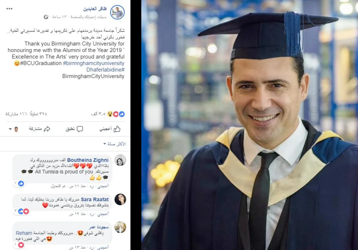 وجه النجم التونسي ظافر العابدين الشكر لإدارة كلية الفن والإعلام بجامعة برمنجهام البريطانية، بعد تكريمه مساء أمس عن مجمل مسيرته الفنية، ضمن فعاليات حفل تخرج الدفعة الجديدة من الكلية، مؤكدا أنه فخور بكونه واحدا من خريجي الجامعة العريقة.