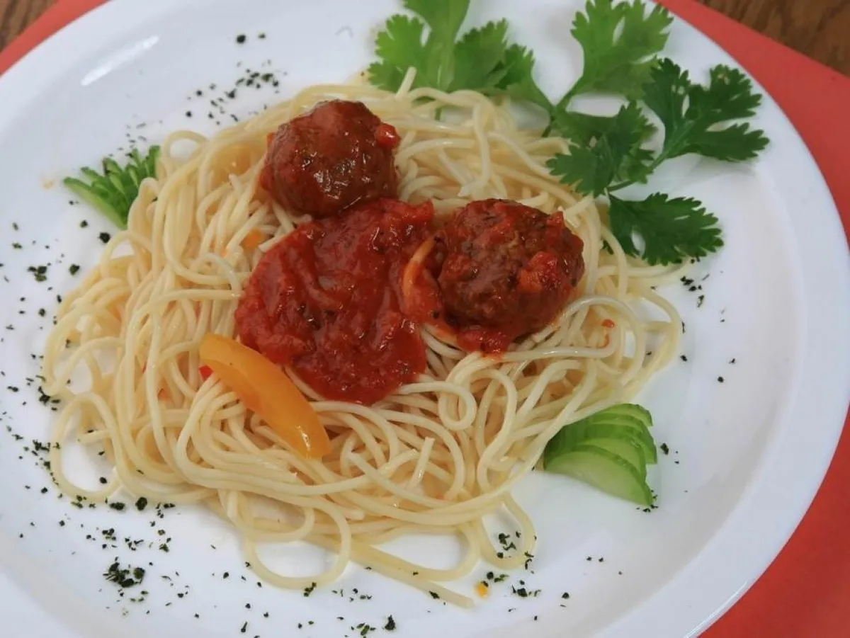 3- تُضاف صلصة البندورة إليها وكرات اللحم، ويُزيّن الوجه بجبن "بارميزان".