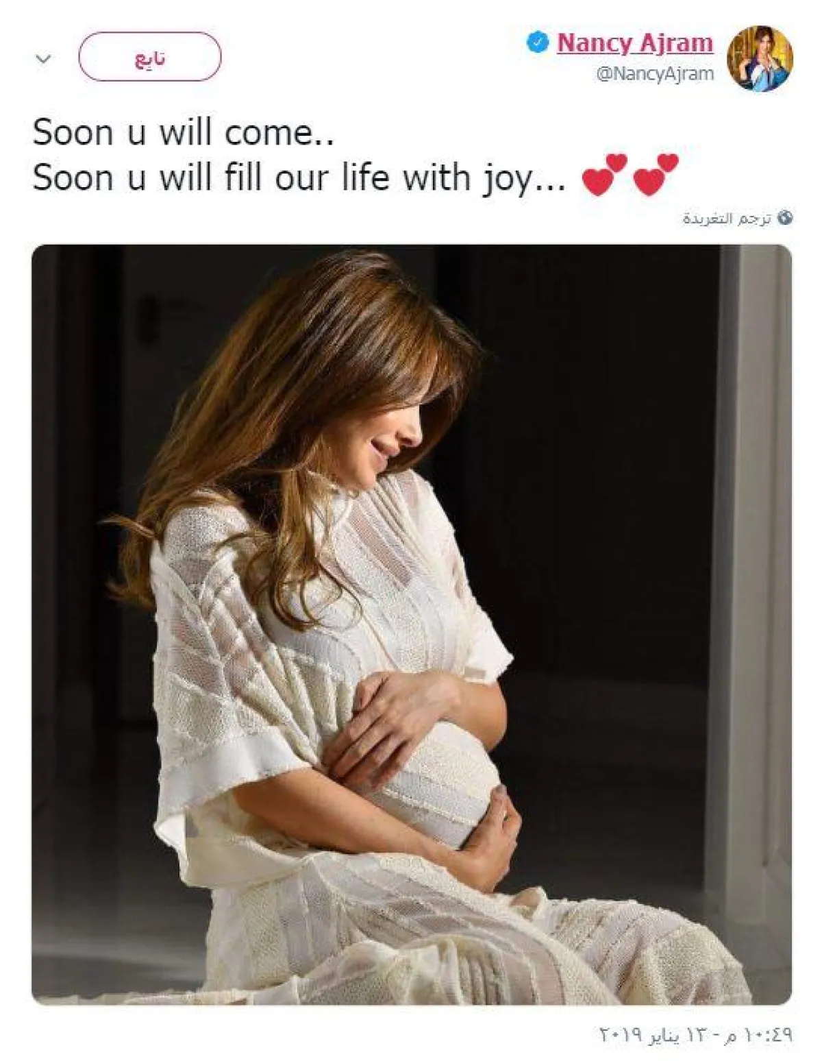 وأطلت نانسي عبر حسابها الرسمي على موقع "تويتر"، ونشرت صورة لها وهي تحتضن بطنها وتخاطب طفلتها المقبلة، قائلةً: "قريبًا سوف تأتين. قريبًا سوف تملئين حياتنا فرحًا".
