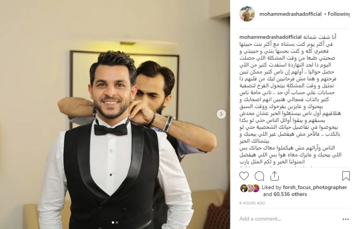 محمد أعاد مشاركة صور لم تنشر من قبل من حفل الزفاف كانت خطيبته مي قد نشرتها منذ يومين وعلق عليها برسالة مؤثرة عبر حسابه بموقع إنستقرام، وقال: أنا شفت شماته في أكتر يوم كنت بستناه مع أكتر بنت حبيتها فعمري كله وكنت بحسها بنتي وحبيبتي وصحبتي.