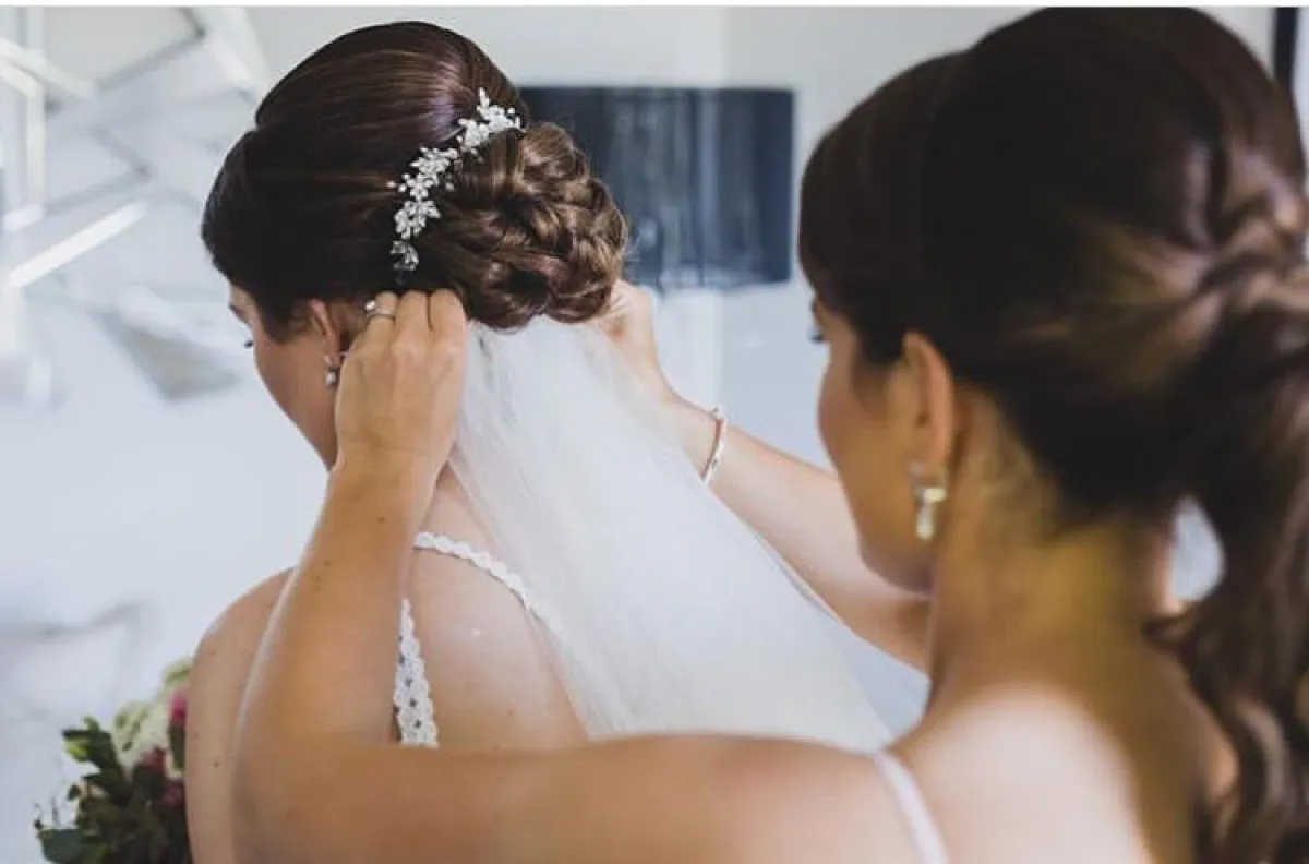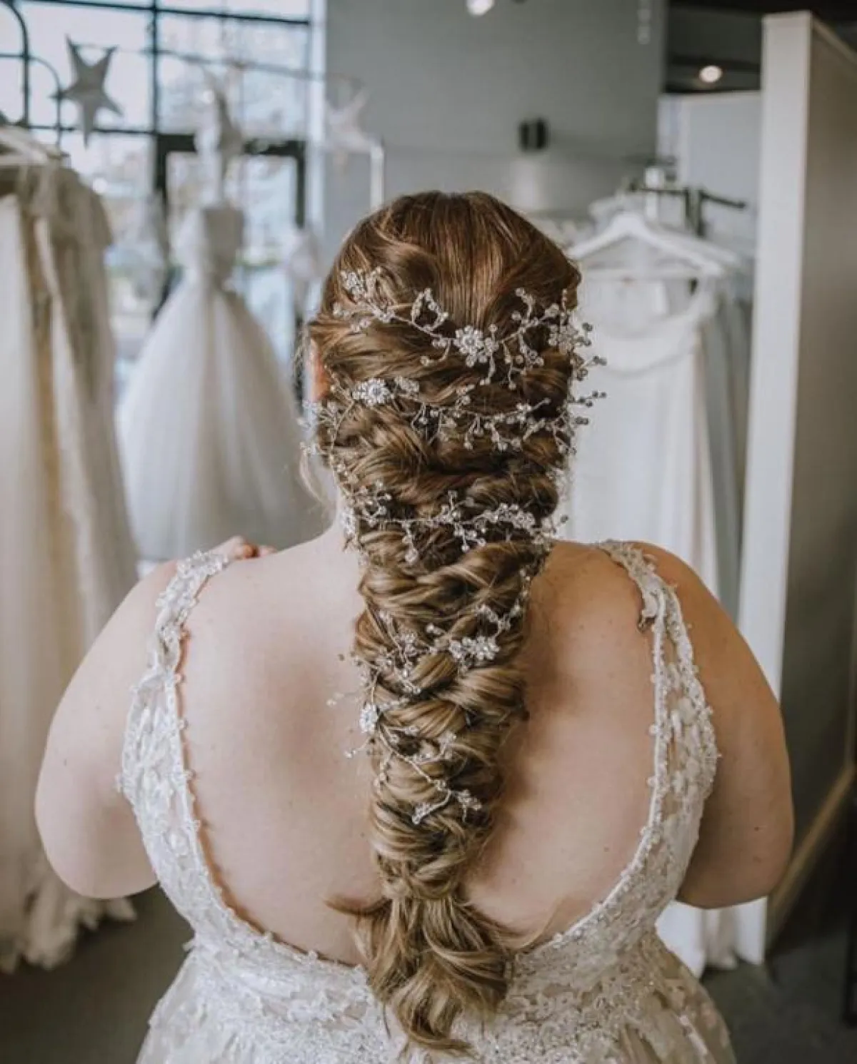 ولكن إن كنتِ ترغبين في ترك شعركِ منسدلًا، بخاصة إن كان شعركِ طويلًا، فيمكنكِ اختيار الضفيرة من كلا جانبَيْ الشعر، ومنسدلة في المنتصف، مع اكسسوار الشعر المرصع بالأحجار على الجبين أو تاج الورود، أو اختاري الشكل التقليدي للتاج الكريستالي.