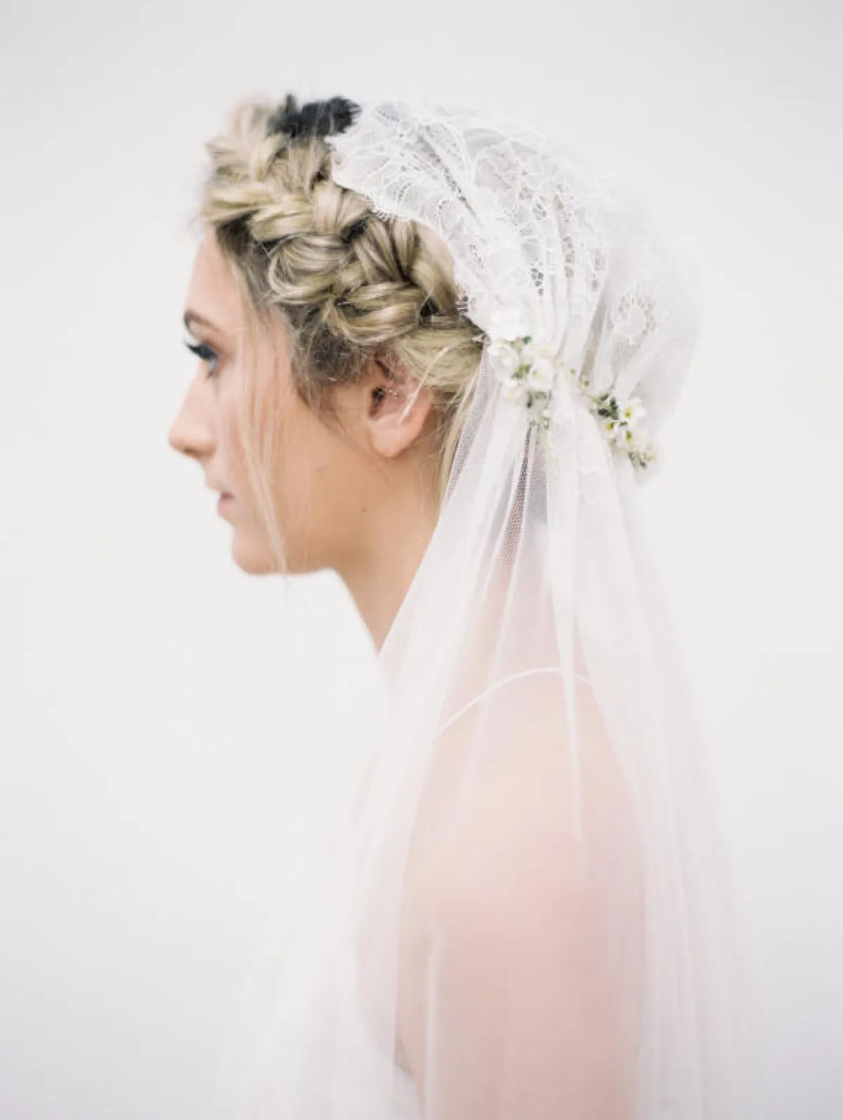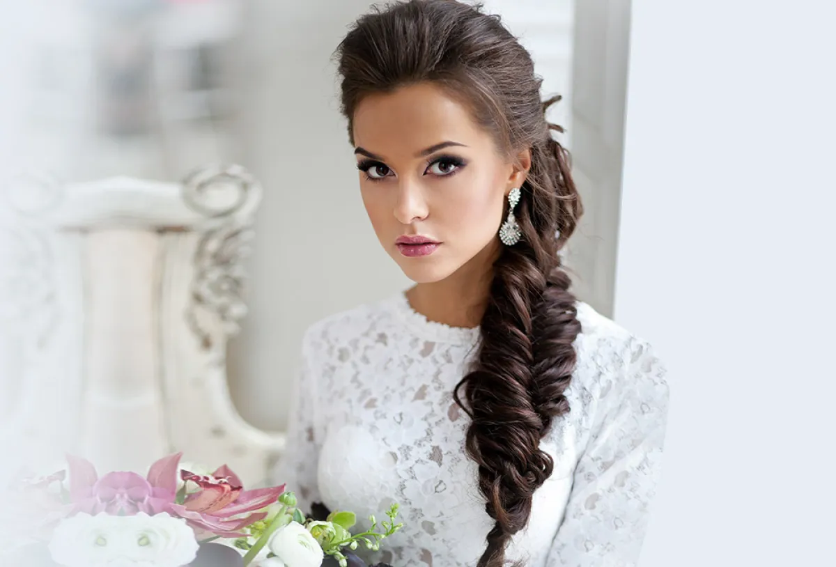 تسريحة الضفيرة ليس شرطًا أن تأخذ الشكل التقليدي المعتاد، يمكنكِ حتى اعتمادها إن رغبتِ في تسريحة الشعر المرفوع، كالتسريحة بالشعر المضفر الملفوف كعكة أسفل رأس، وتنسدل الطرحة لمن ترغب بها ، مع التاج الفخم.