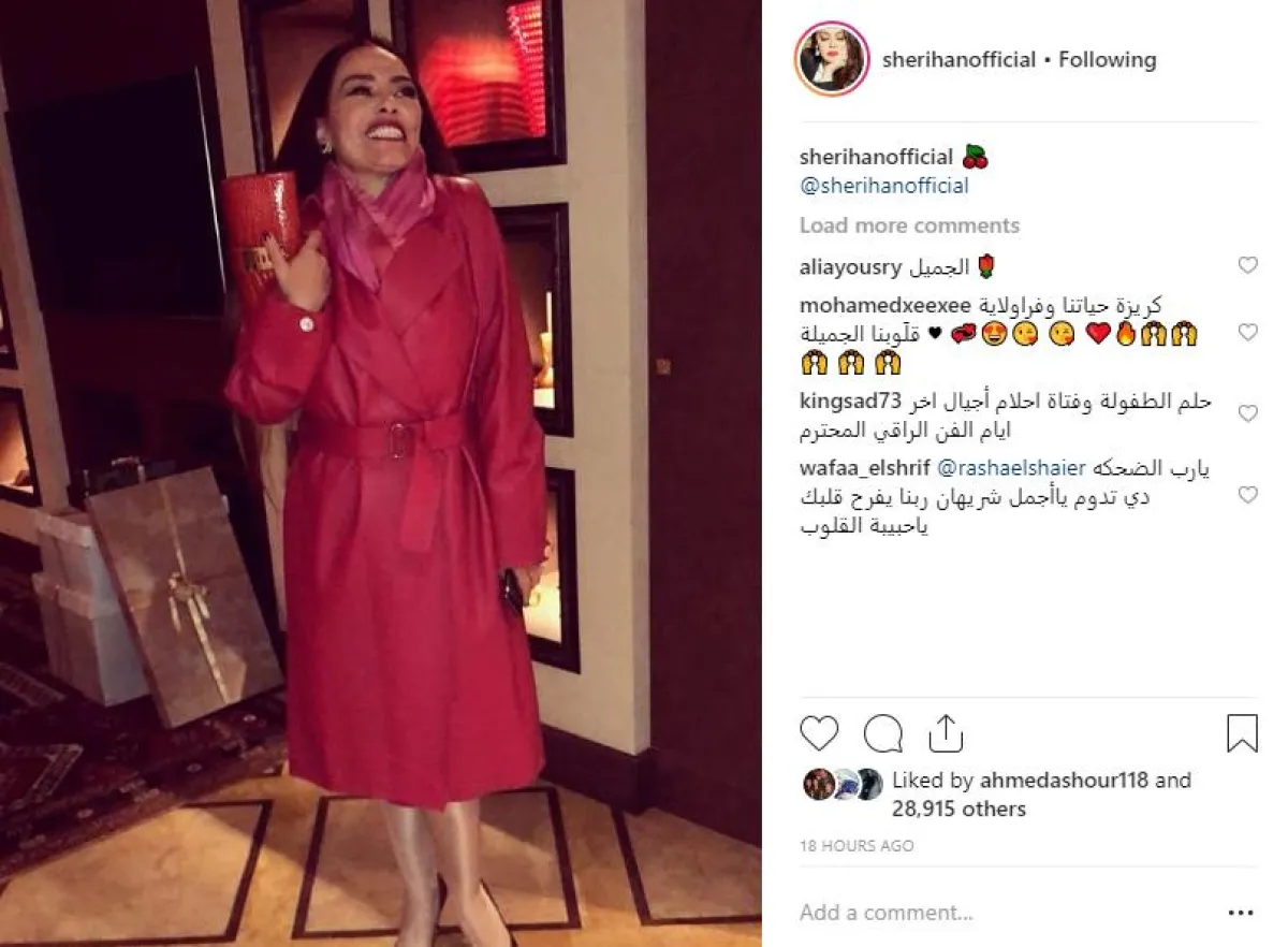 شريهان الحريصة على التواصل مع جمهورها بنشر الصور المتعلقة بإطلالتها، فاجأت الجميع بإطلالة كاملة باللون الأحمر الناري، ووضعت أيقونة حبة الكرز، على الصورة الأولى، بينما وضعت اسم حسابها على الصورة الثانية، وفتحت خاصية التعليق على الصور، ليتبارى عشاقها في الإشادة بجمالها وأناقتها، وكيف تمكنت من الحفاظ على رشاقتها رغم احتفالها مؤخرًا بعيد ميلادها الرابع والخمسين، ومرورها بأزمة صحية طويلة وقاسية.