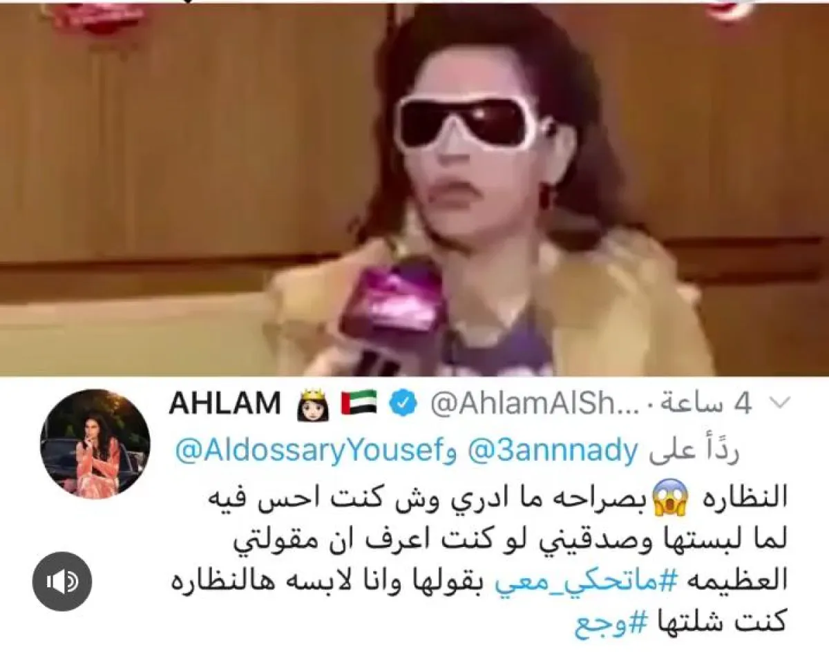 وعلقت أحلام على الفيديو المتداول: "النظارة بصراحة ما أدري وش كنت أحس فيه لما لبستها، وصدقوني لو كنت أعرف إنّ مقولتي العظيمة.. ما تحكي معي بقولّها وأنا لابسة هالنظارة كنت شلتها.. وجع".