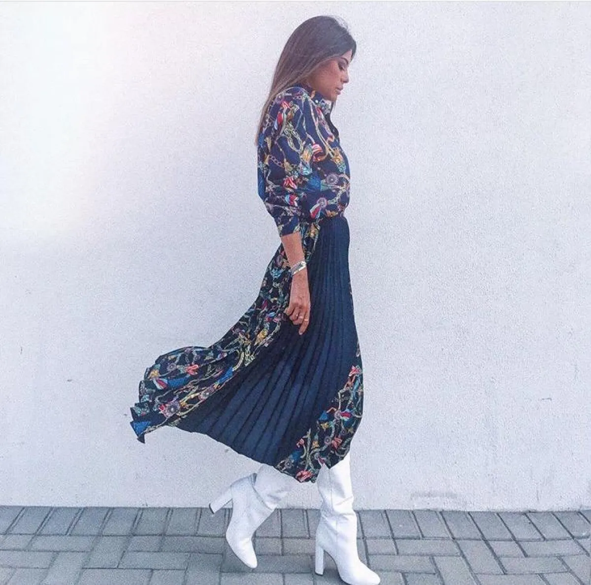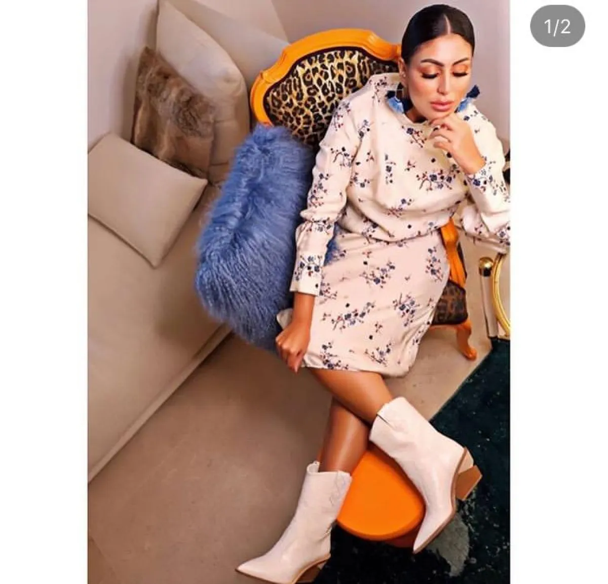 والبوت نفسه اختارته المدونة الخليجية دانا الطويرش، لكنها نسقته مع فستان معرق برسومات الورود والفروع الخشبية، التي تلائم الكعب البيج للبوت الأبيض، لشكل عصري وجذاب.