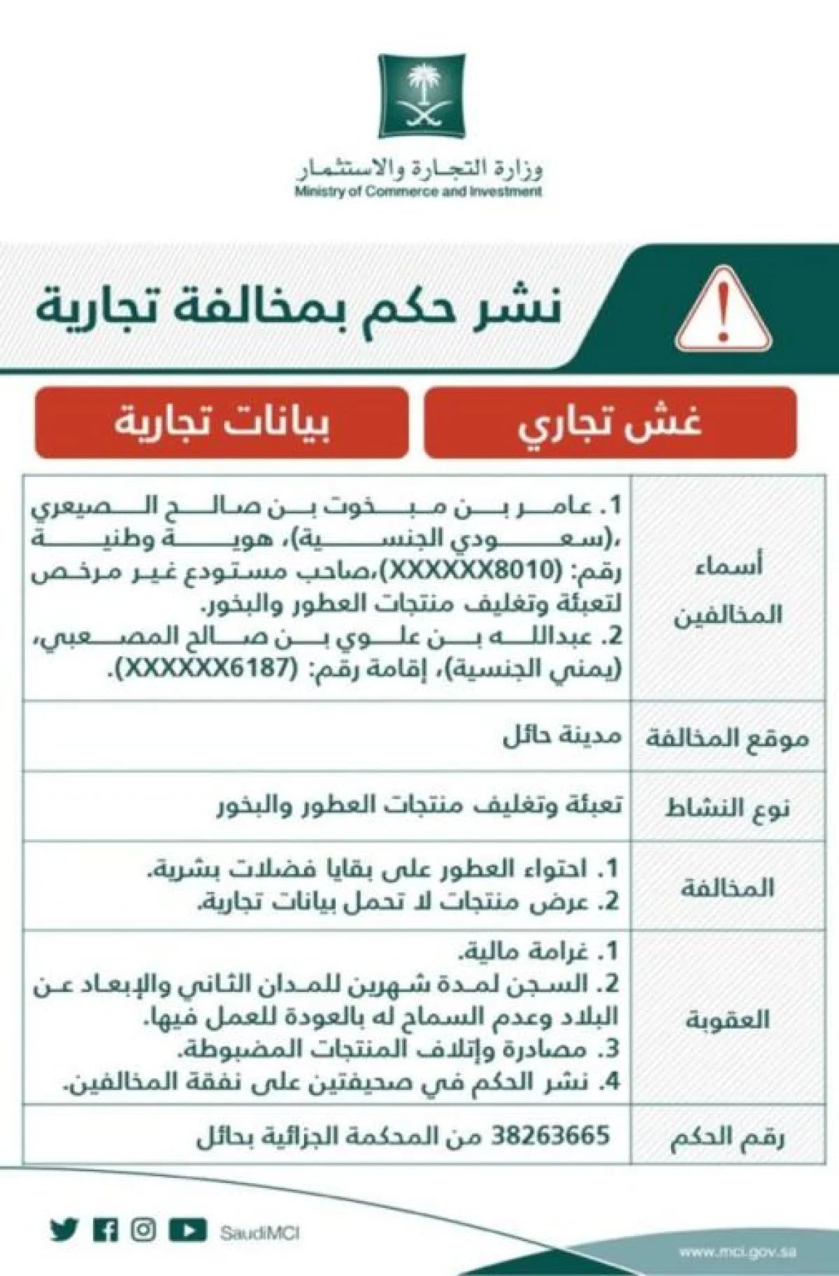 بدورها أوضحت الوزارة أنّ نوع النشاط تعبئة وتغليف منتجات العطور والبخور في مدينة حائل، واشتملت المخالفة على احتواء العطور على بقايا فضلات بشرية، وعرض منتجات لا تحمل بيانات تجارية.