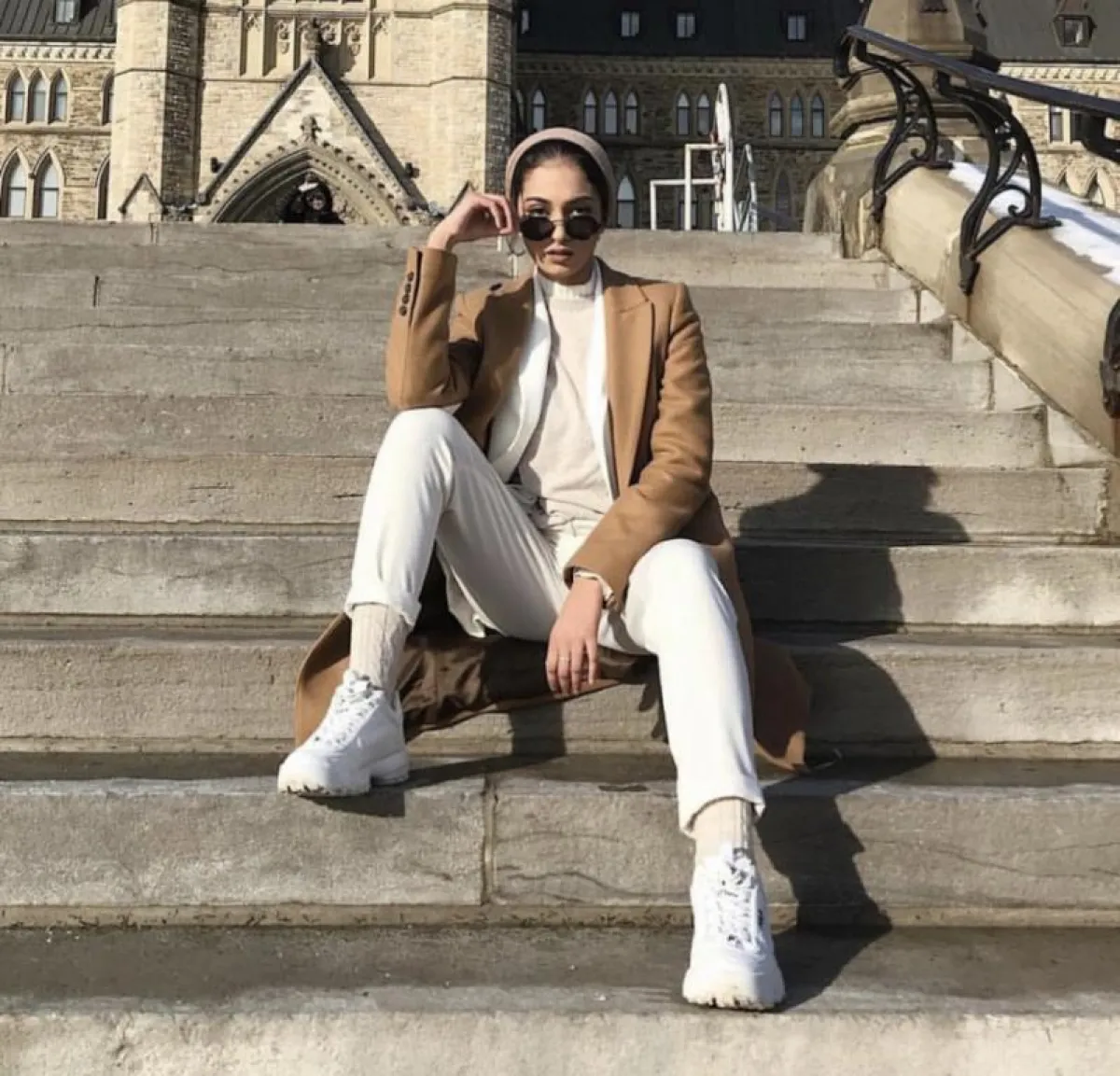 يمكن ارتداء سروال ابيض اللون مع بلوزة من الباج ووضع جاكيت من المخمل او الجوخ فوقها.