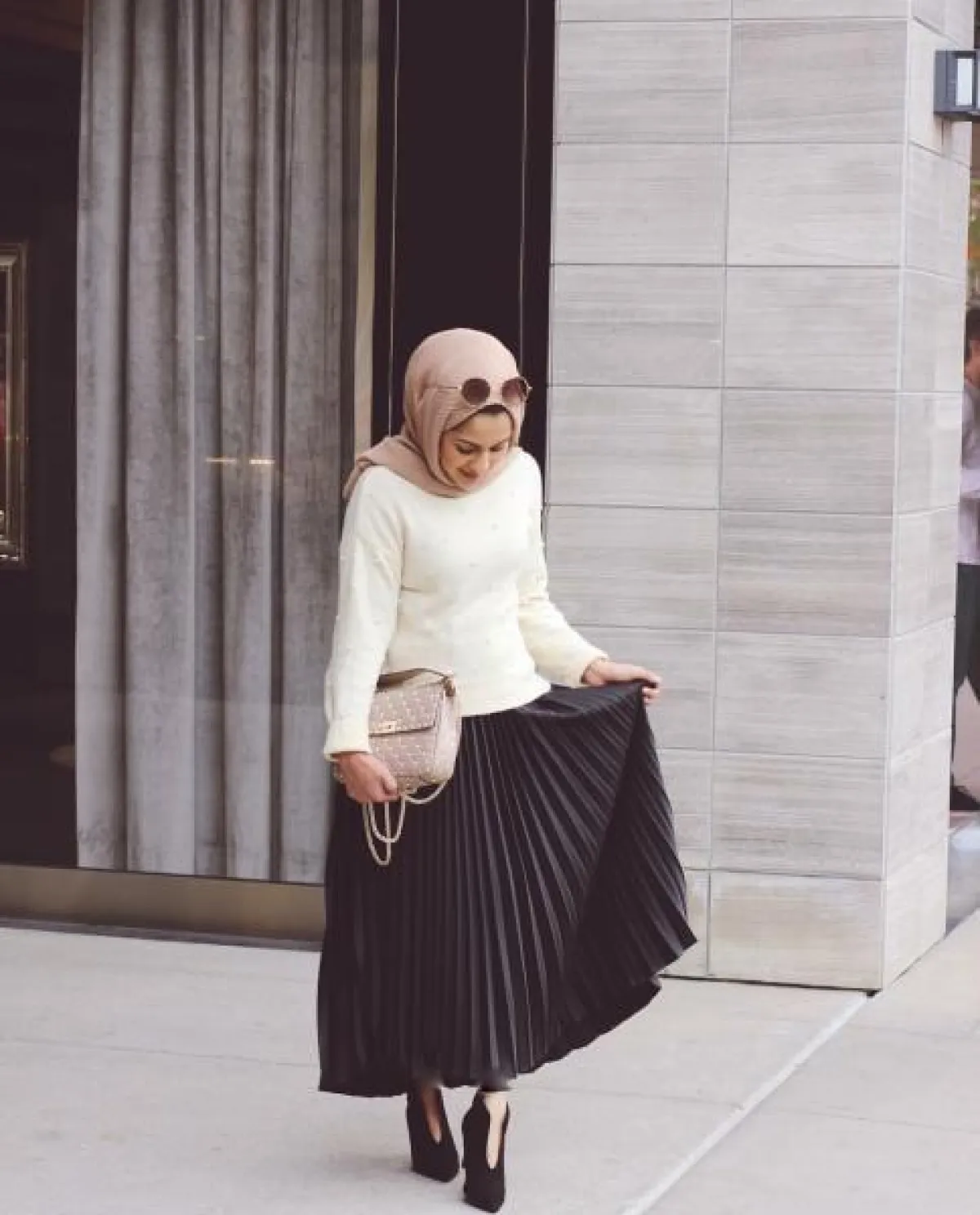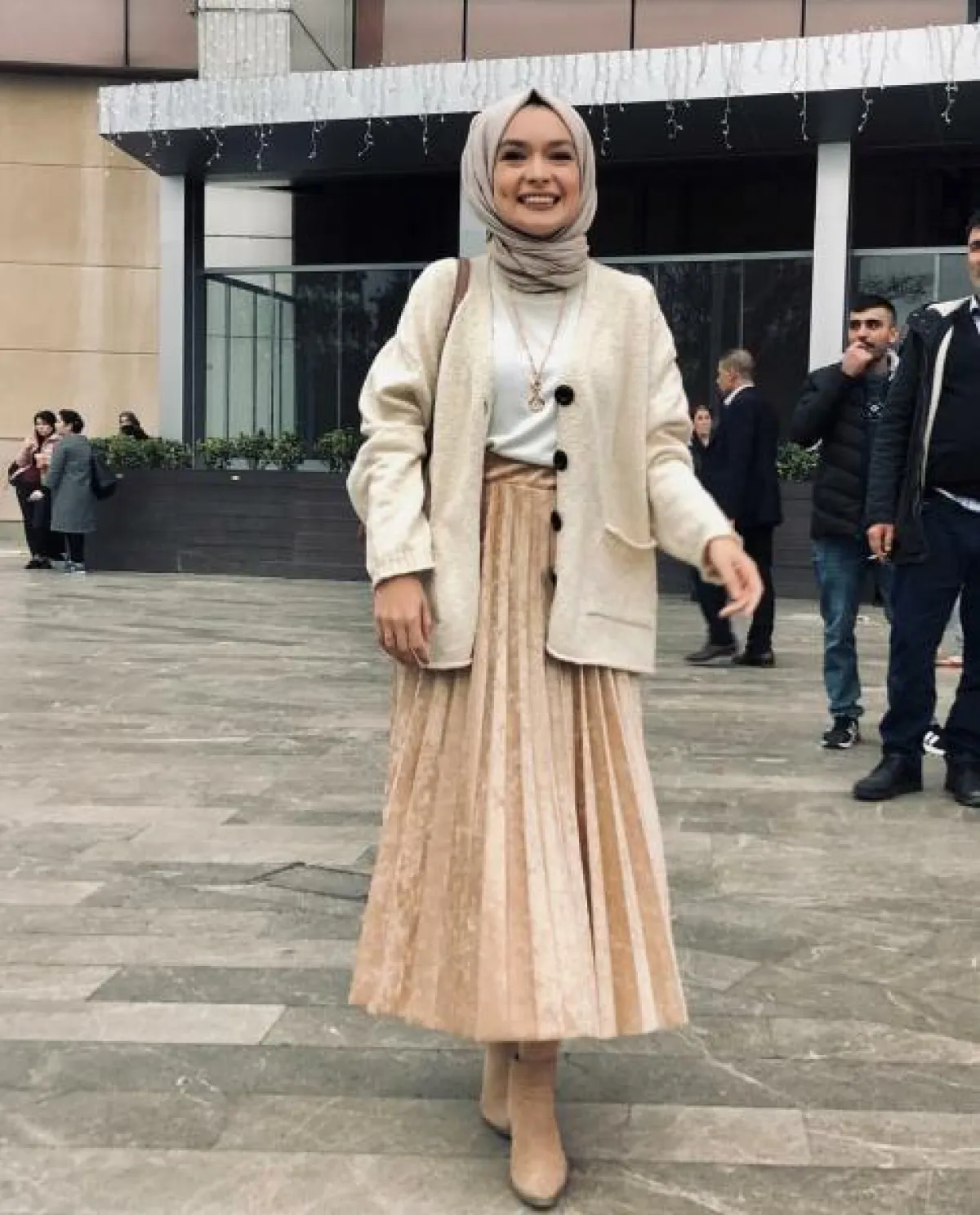 - مع الغالبية الساحقة للـ تنورة المكسرة لابد أنكِ تملكين أكثر من قطعة من هذه الصيحة الرائجة، ولكن عليكِ إعتماد تنورة بليسيه من المخمل لتواكبي إتجاهات شتاء 2019، ونسقيها مع توب أبيض وكارديغان قصير من نفس اللون.