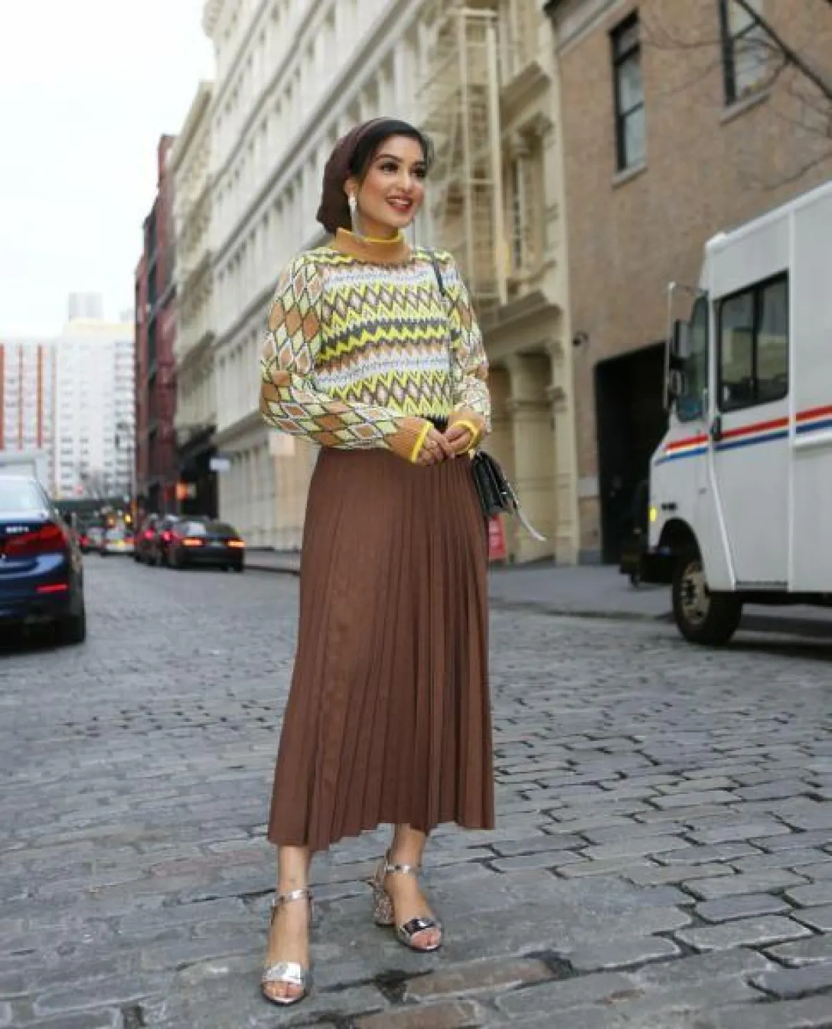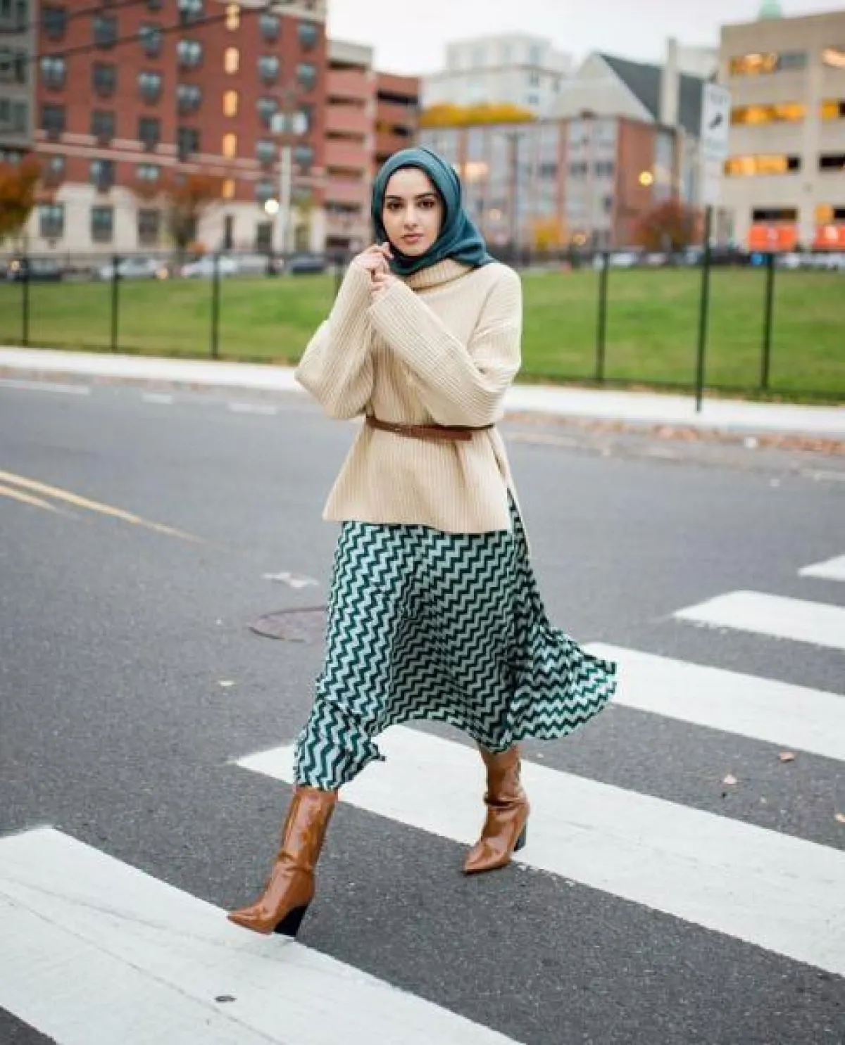 -نسقي التنورة المزركشة مع توب بلون واحد فأستوحي من الفاشينيستا سمر البرشا وأعتمدي التنورة المطبعة بالأخضر مع كنزة باج وزيني خصرك بحزام جملي رفيع من نفس لون البوت.