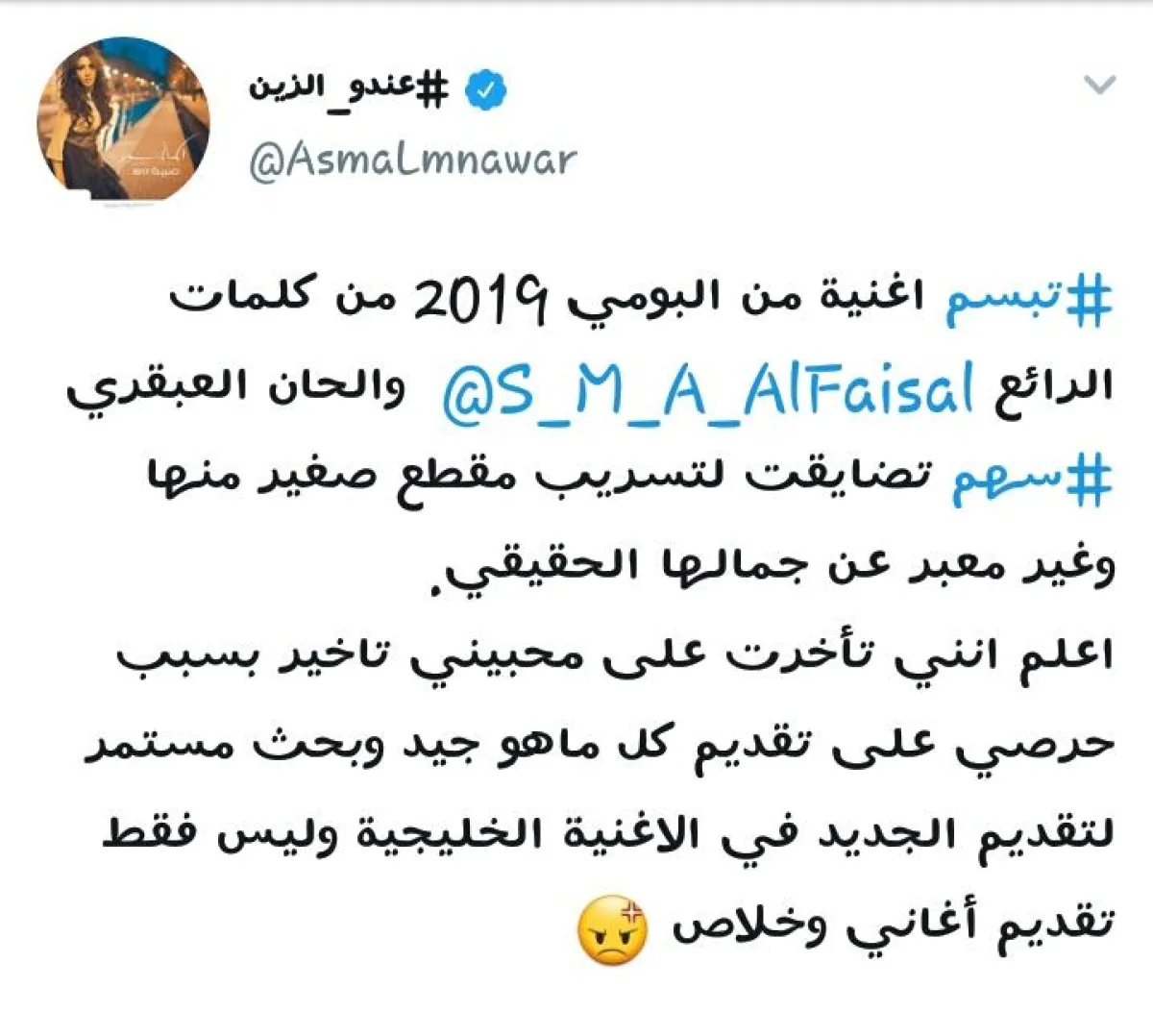 وكتبت لمنور في تغريدتها على موقع التواصل الاجتماعي "تويتر"، "تبسم أغنية من ألبومي 2019 من كلمات الرائع سعود محمد عبد الله الفيصل، وألحان العبقري سهم، تضايقت لتسريب مقطع صغير منها وغير معبر عن جمالها الحقيقي"، مضيفة: "أعلم أنني تأخرت على محبيني تأخير بسبب حرصي على تقديم كل ما هو جيد وبحث مستمر لتقديم الجديد في الأغنية الخليجية وليس فقط تقديم أغاني وخلاص".