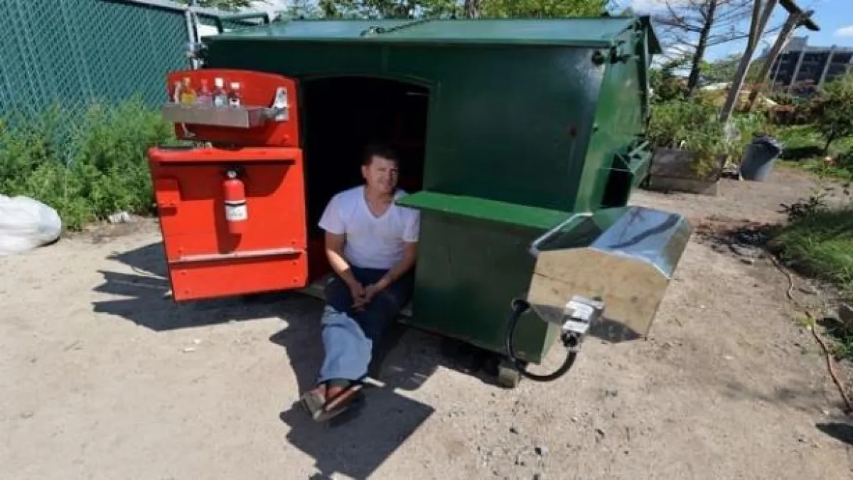 هل من الممكن أن يستطيع شخص ما السكن في حاوية للقمامات ويعتبرها منزلاً له؟؟ الفنان غريغوري كلوين جعل من هذا الشيء ممكناً؛ فلقد حول حاوية نفايات إلى شقة تتسع لشخصين مع موقع لشواء اللحم وشرفة على السطح.