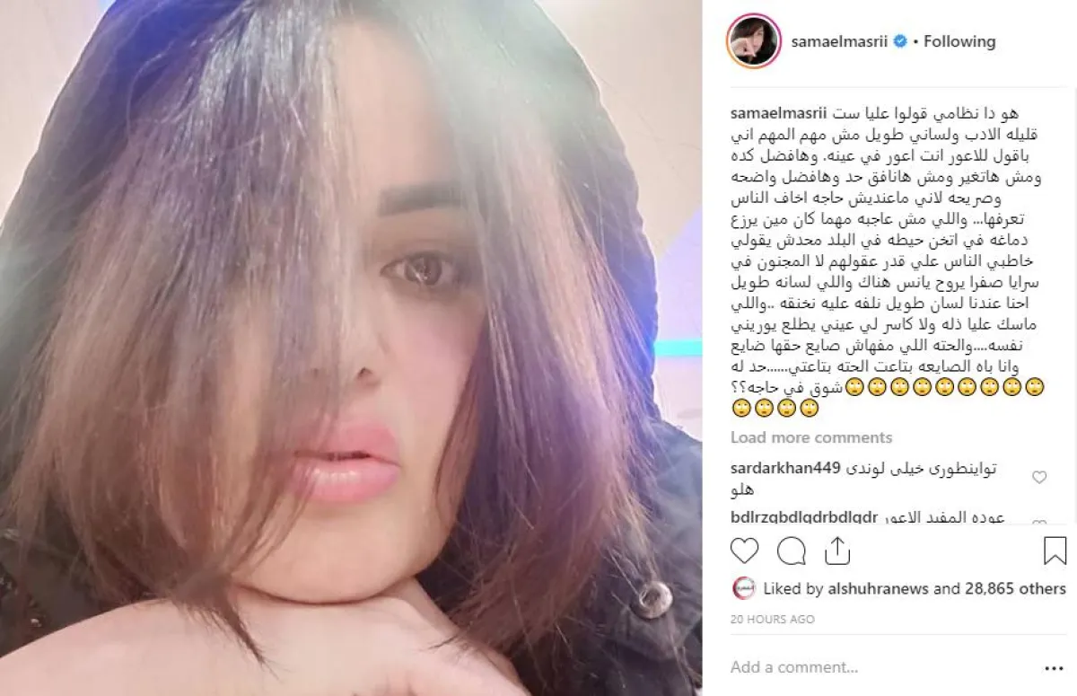 سما تعرضت للعديد من الانتقادات مؤخرًا بسبب تصريحاتها الجريئة بحق الشخصيات العامة داخل مصر وخارجها، وقررت الرد على الجميع مرة واحدة ونشرت صورتها عبر حسابها بموقع انستقرام، وعلقت عليها قائلة: هوّ دا نظامي قولوا عليّا ست قليلة الأدب ولساني طويل، مش مهم، المهم إني باقول للأعور إنت أعور في عينه. وهافضل كدة ومش هاتغيّر ومش هانافق حد، وهافضل واضحة وصريحة، لاني ماعنديش حاجة أخاف الناس تعرفها...