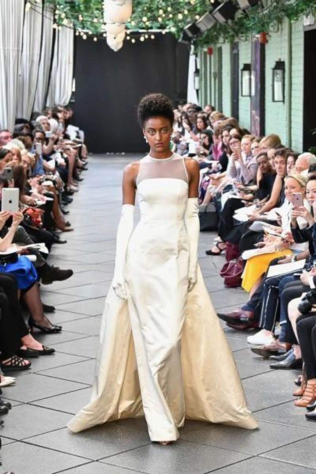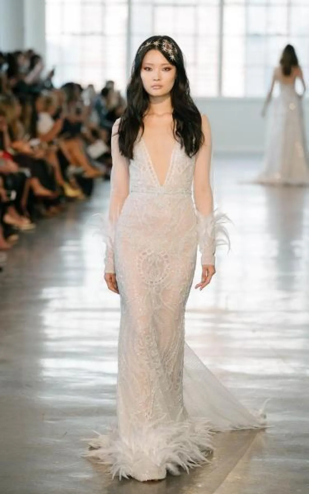 أما ماركة بيرتا berta فقدمت القفازات التي لا تغطي الأصابع والمزينة بالريش من أعلى لتضيف لمسة فاخرة لإطلالة العروس.