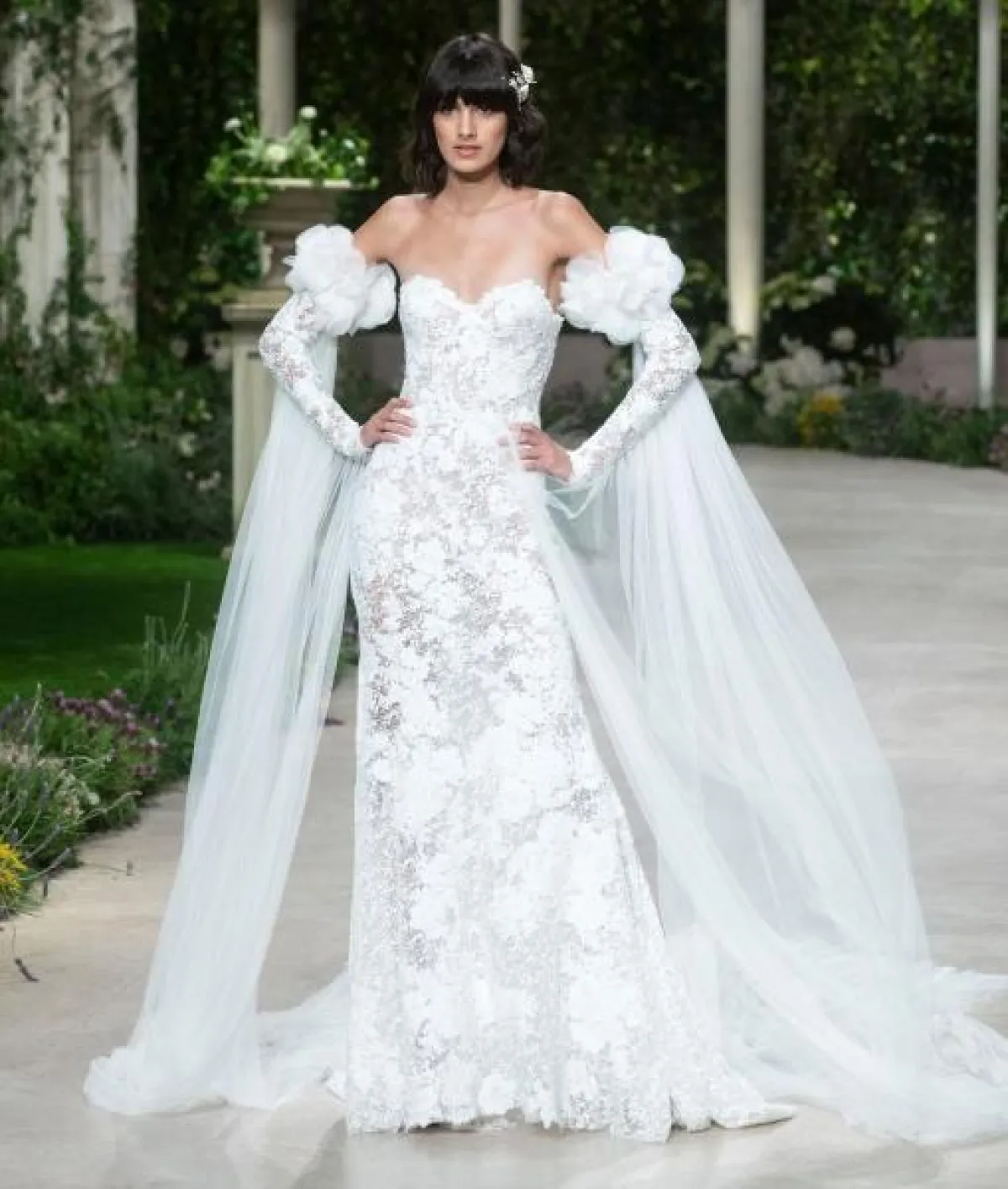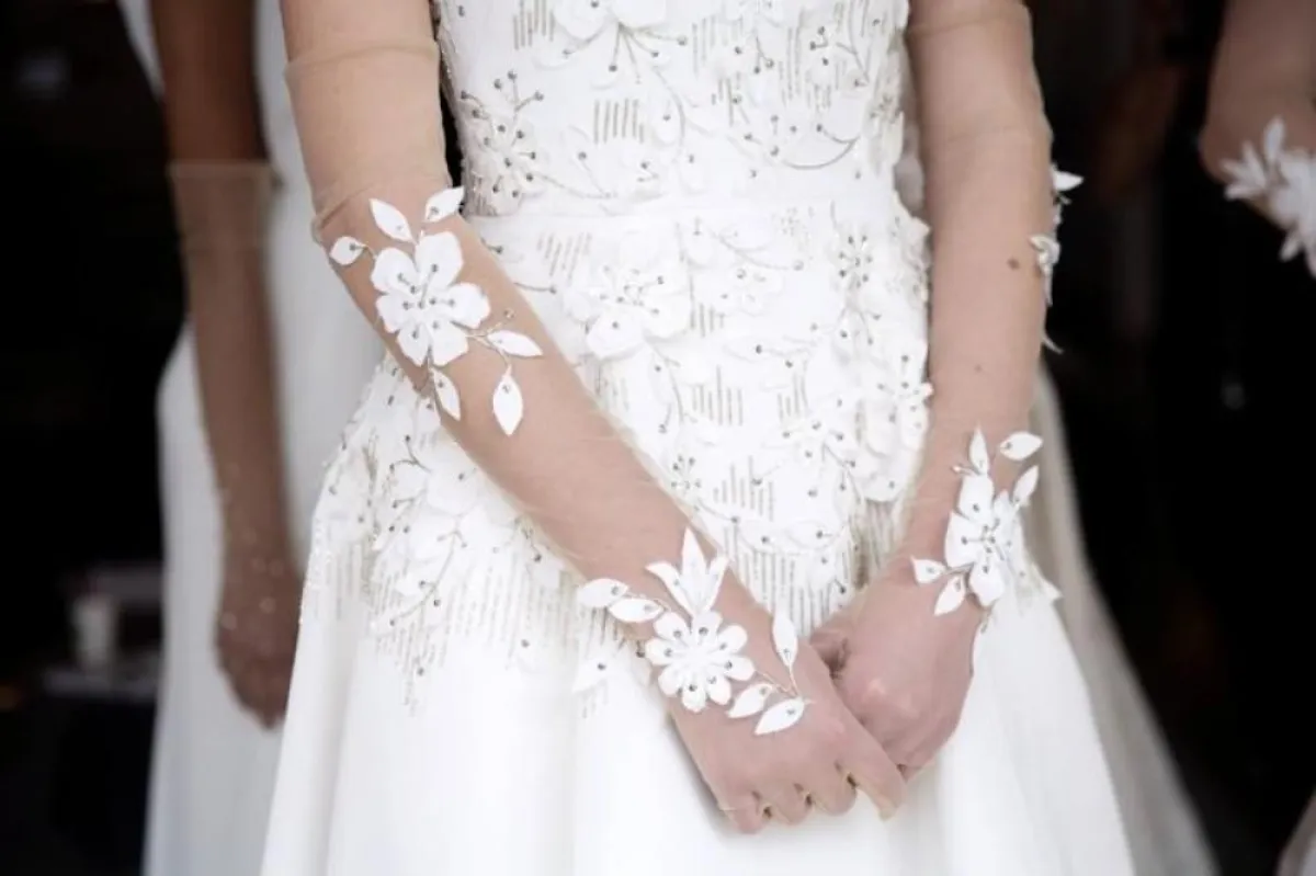 أيضاً برزت القفازات لدى ماركة Mira Zwillinger، وهي مصنوعة من التول أو الأورغانزا، ومنها المزين بـ ورود بيضاء بارزة أو المرصع بتطريزات برّاقة.