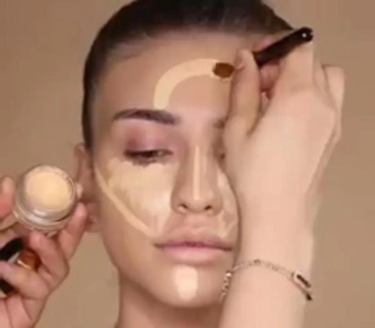 - طبقي الكونسيلر الفاتح تحت العينين على شكل مثلث وفوق الجبين بشكل دائري وعند الذقن وخط في وسط الانف.