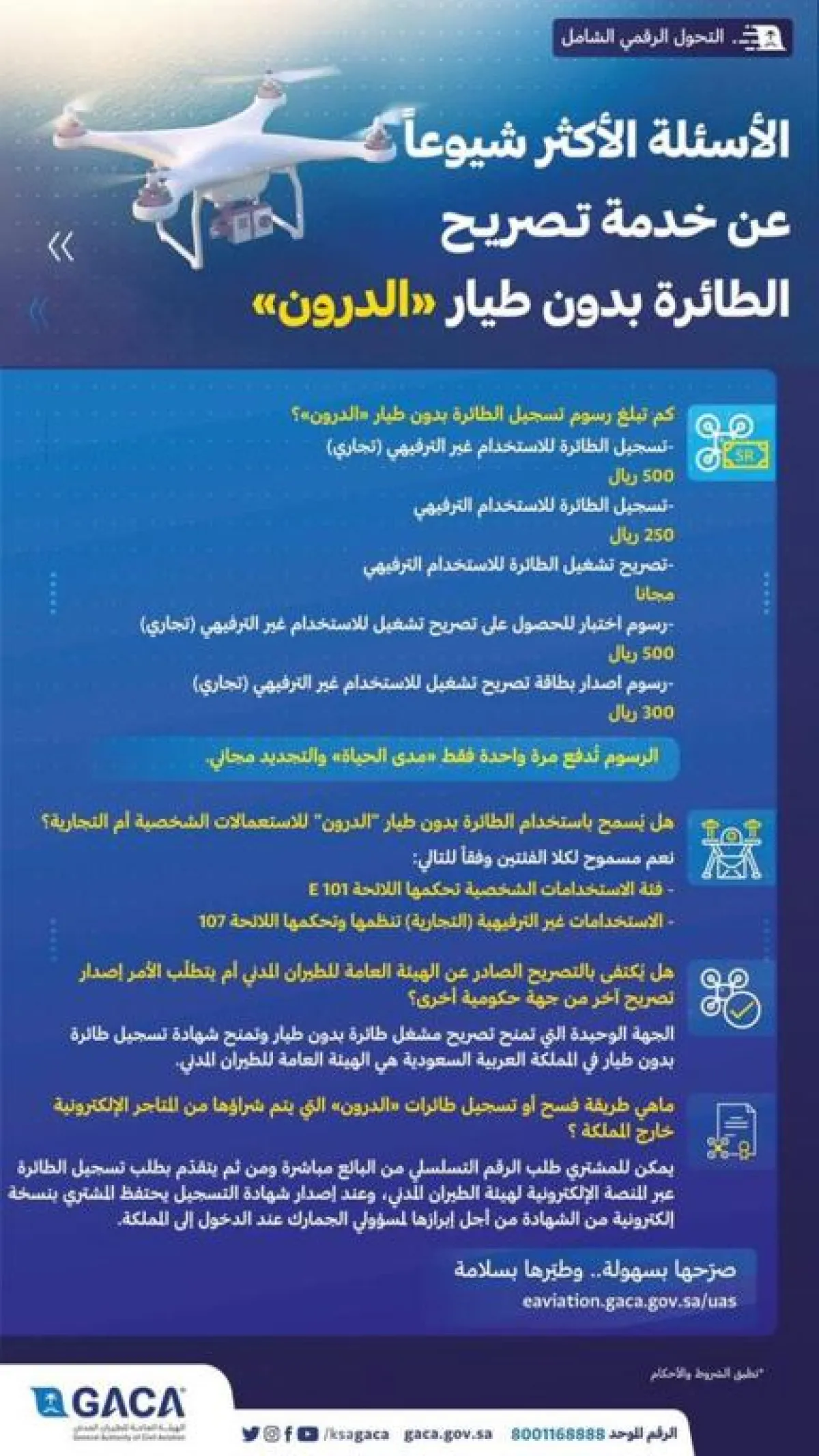 ونشرت الهيئة، عبر حسابها الرسمي على موقع "تويتر"، انفوجرافيك عن رسوم تسجيل "الدرون" للاستخدام غير الترفيهي "التجاري" 500 ريال، وللترفيهي 250، وتصريح تشغيل الترفيهي مجاناً.