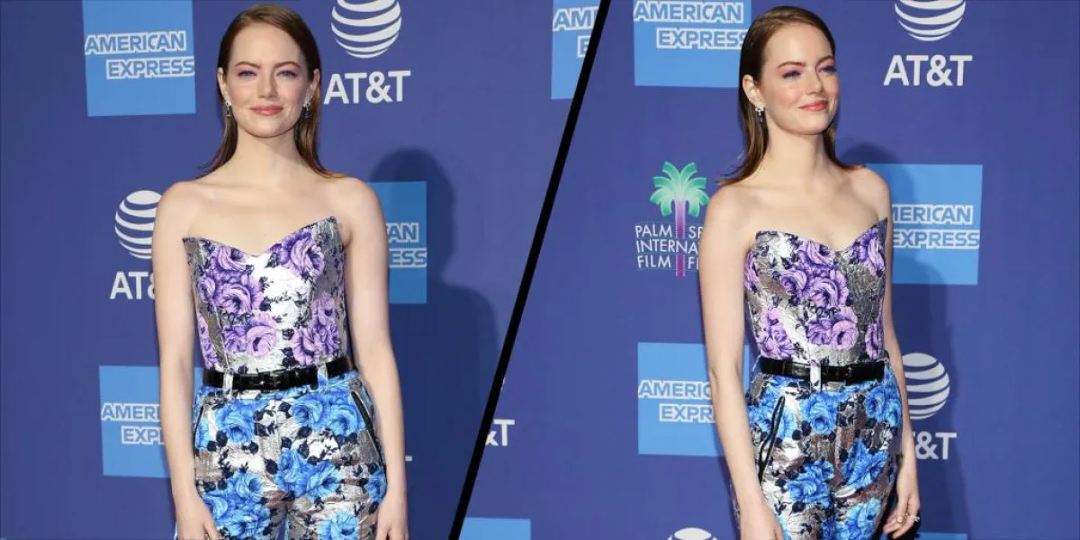 اعتمدت الممثلة الأمريكية، إيما ستون اطلالة بدت للوهلة الأولى جمبسوت، لكنها في الحقيقة مكونة من قطعتين متجانستين من نسيج الجاكار، المزدان بالزهور المتشابكة من الأزرق والأرجواني، على خلفية فضية.