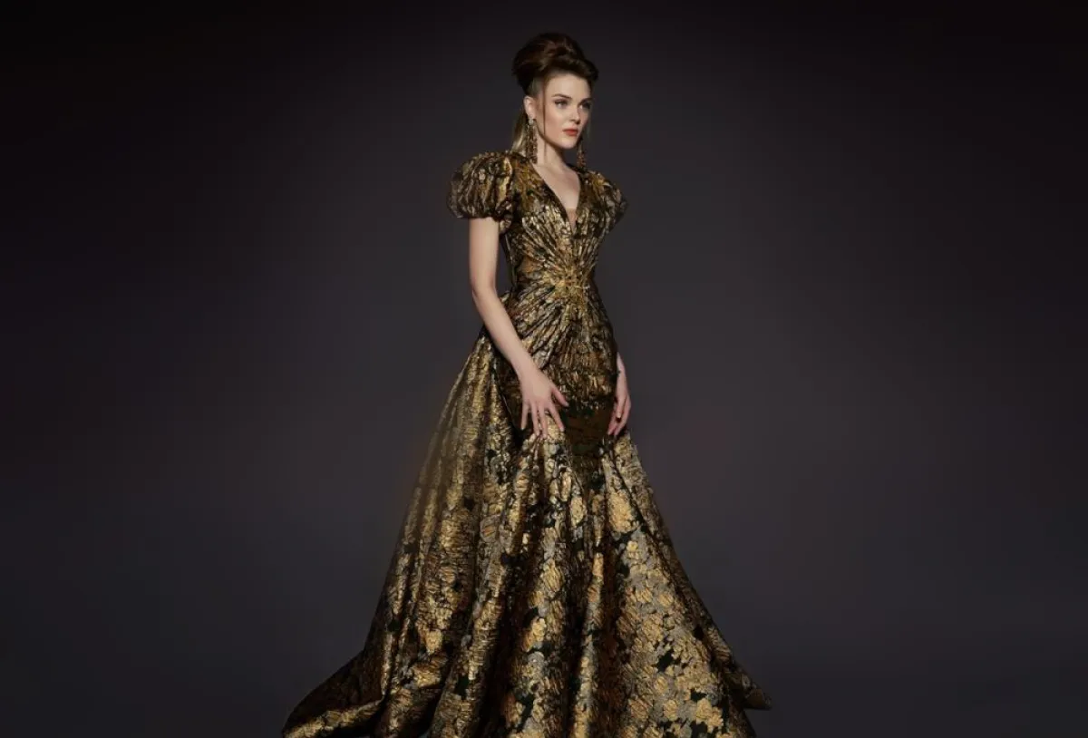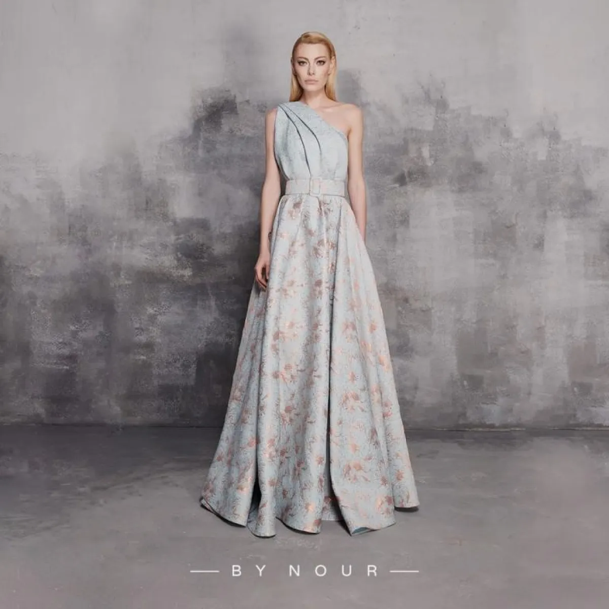 كذلك قدمت علامة "نون باي نور"، عددًا من التصاميم الفاخرة بقماش الجاكار، تنوعت الألوان بين درجات السماوي المطعّم بالنحاسي والذهبي.