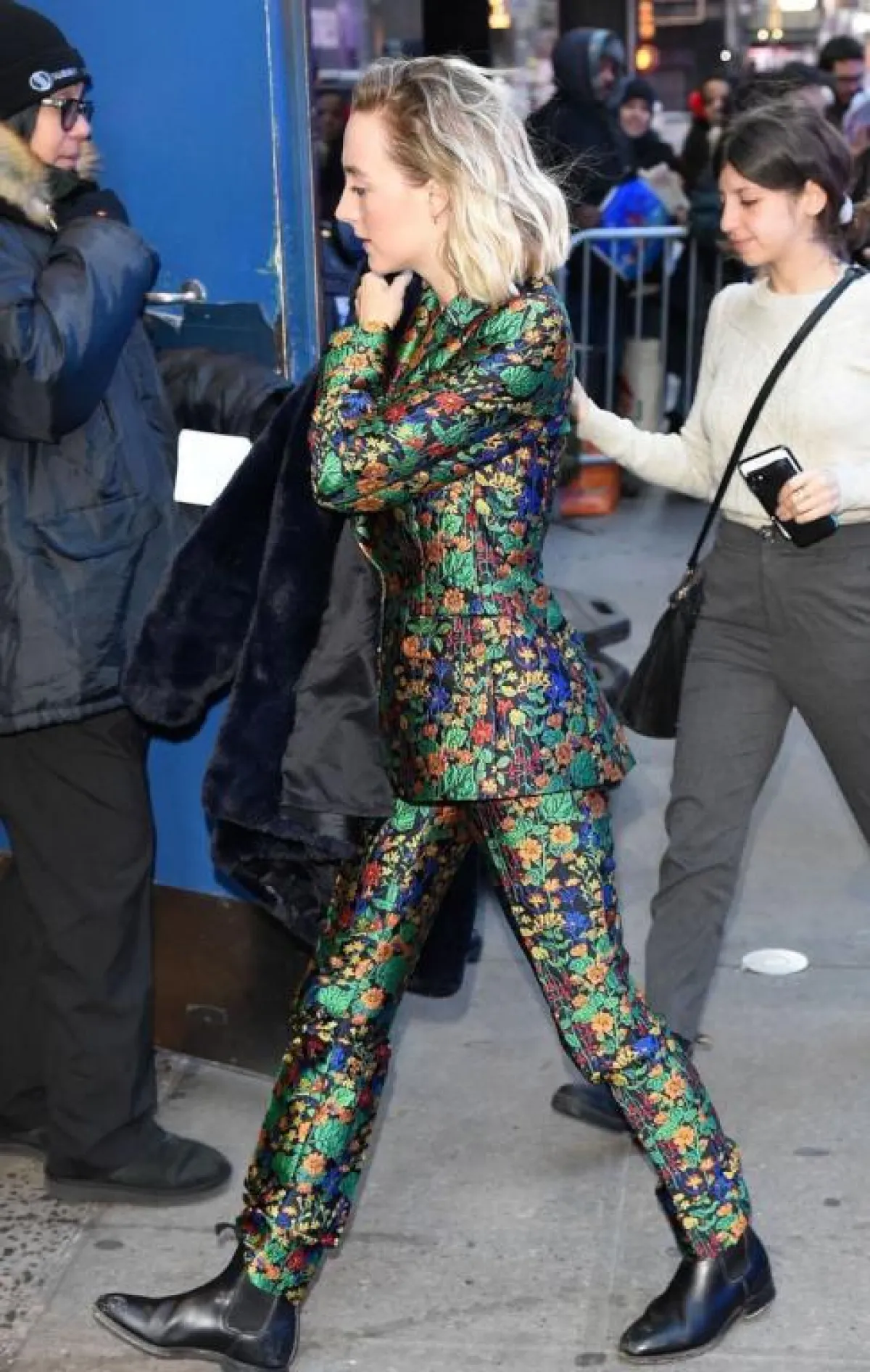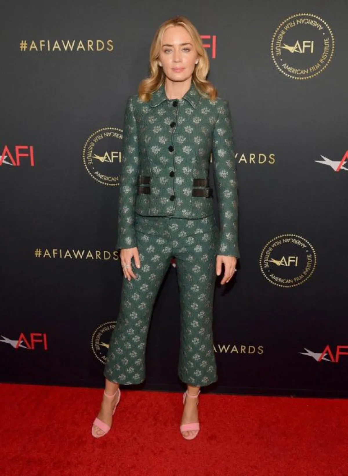 بعد اطلالة إيما ستون الأنيقة، ظهرت الممثلة الأمريكية إيميلي بلنت ببدلة كاملة من قماش الجاكار السميك، المزدان بطبعة الزهور الفضية على خلفية من الأخضر الداكن، ليحقق مزيجًا لونيًّا غير معتاد، ونسقت اطلالتها الأنيقة مع زوج من الأحذية الأنيقة بمقدمة مدببة.