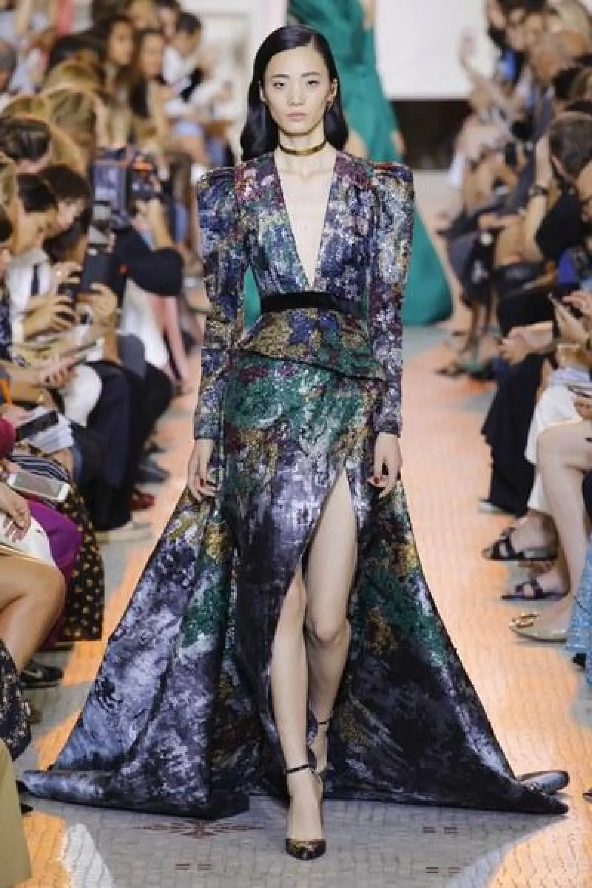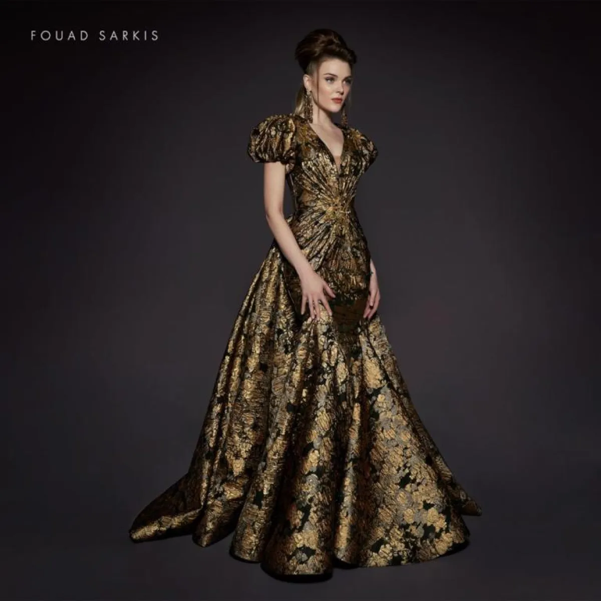 أما المصمم فؤاد سركيس فقدّم أيضًا فساتين جاكار بتنانير طويلة ومنفوشة، وذهب إلى ألوان غير معتادة، مثل الكحلي المزين بورود بارزة من اللون نفسه، واستغل الخامة السميكة للجاكار، وقدّم صيحة الأكمام المنفوخة بأسلوب مُتقن.
