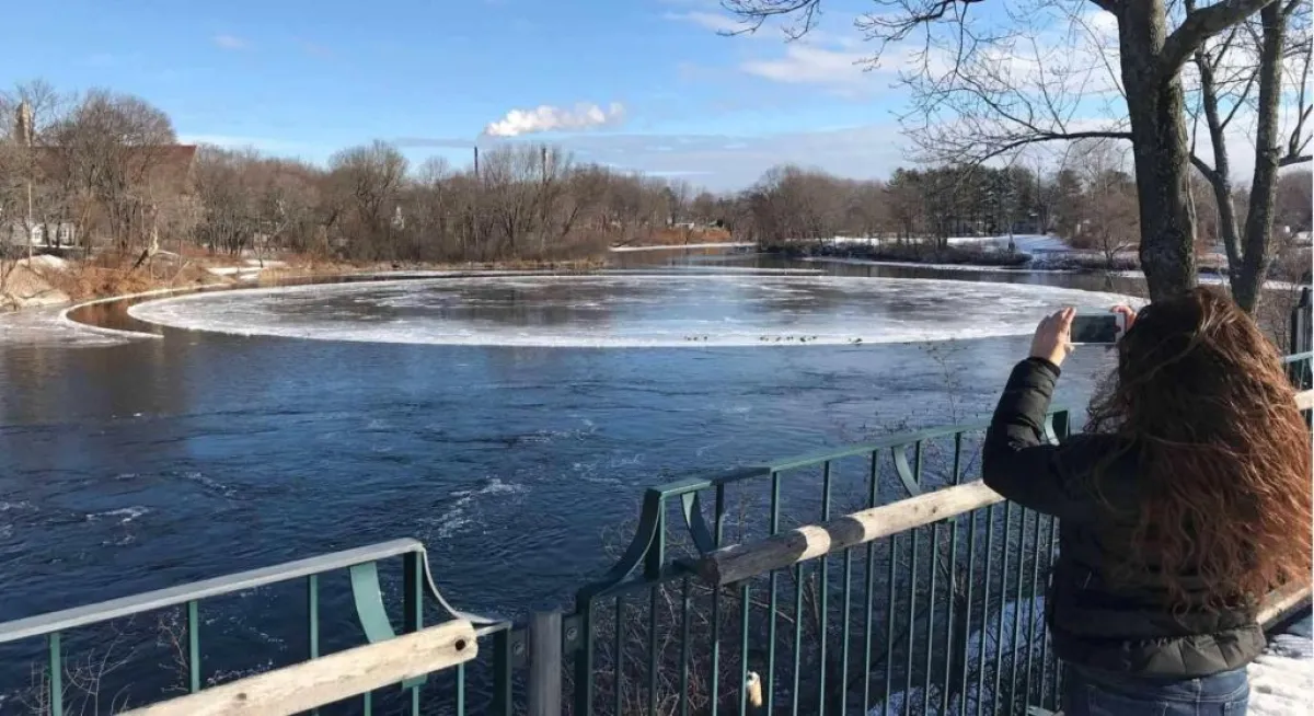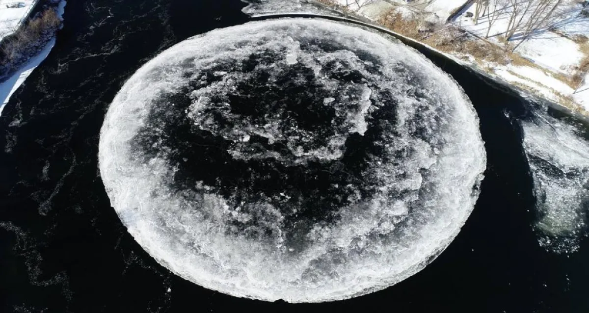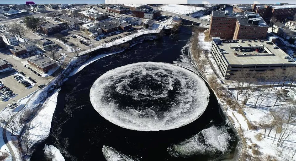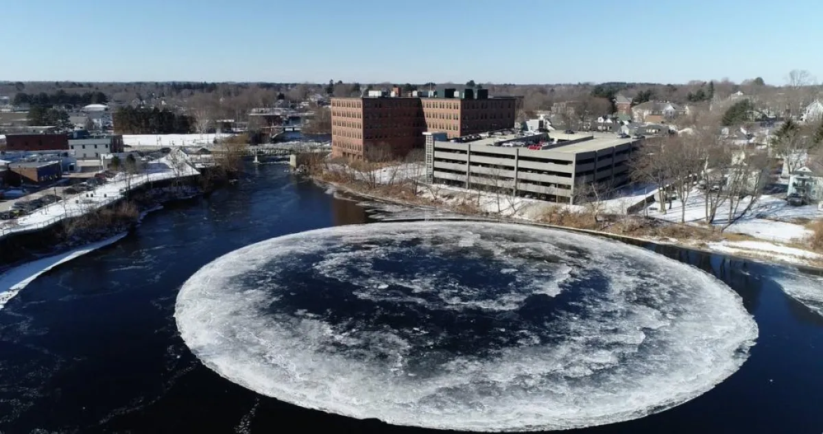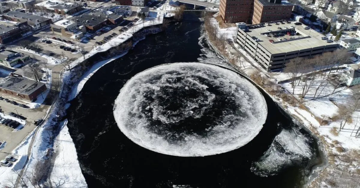 وبحسب ما ذكره موقع «سكاي نيوز»، فإن تشكيلاً غريباً كان قد جذب انتباه الكثيرين إلى منطقة «بورتلاند» الكبرى في ولاية ماين الأميركية، وهو في الواقع عبارة عن قرص ثلج دوار وضخم للغاية، يبلغ عرضه قرابة الـ 100 متر، وكان قد ظهر على سطح مياه أحد أنهار الولاية الأمريكية.
