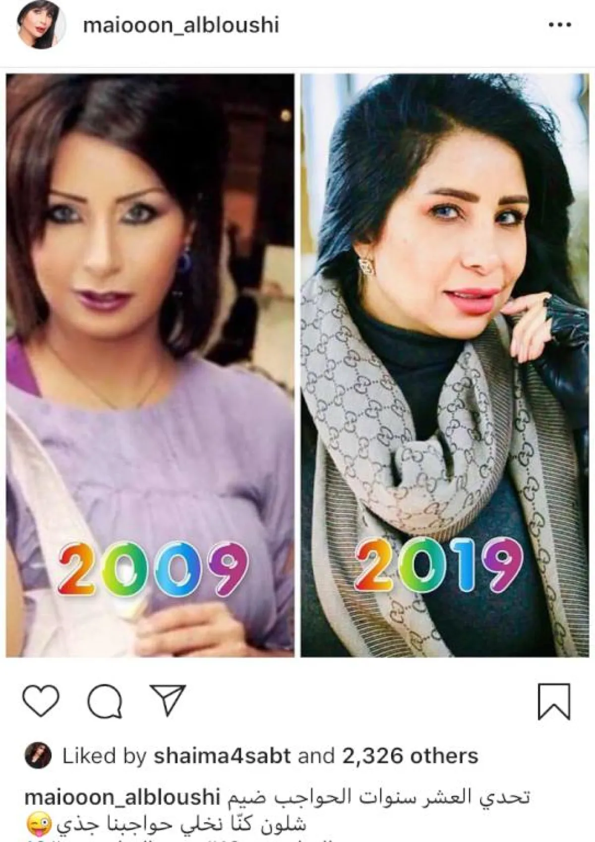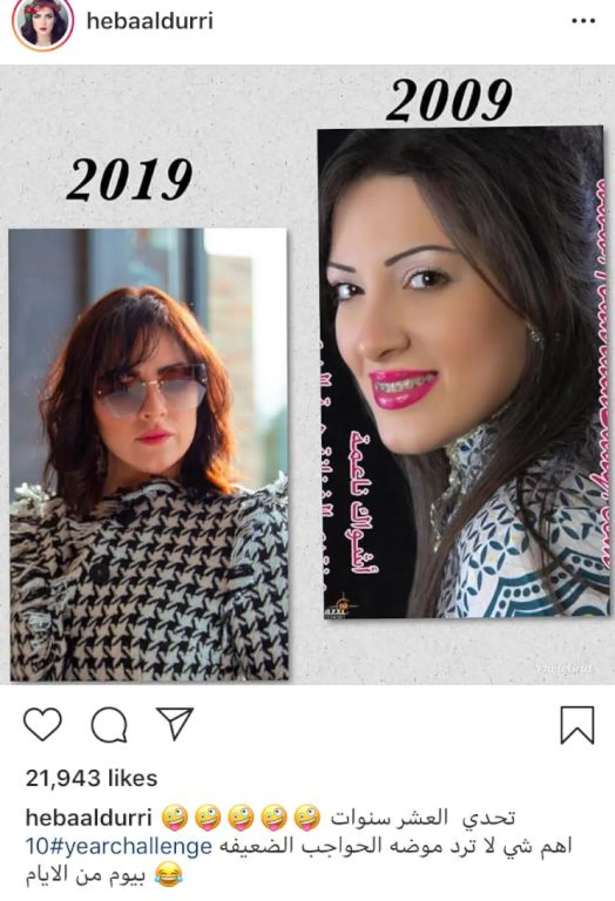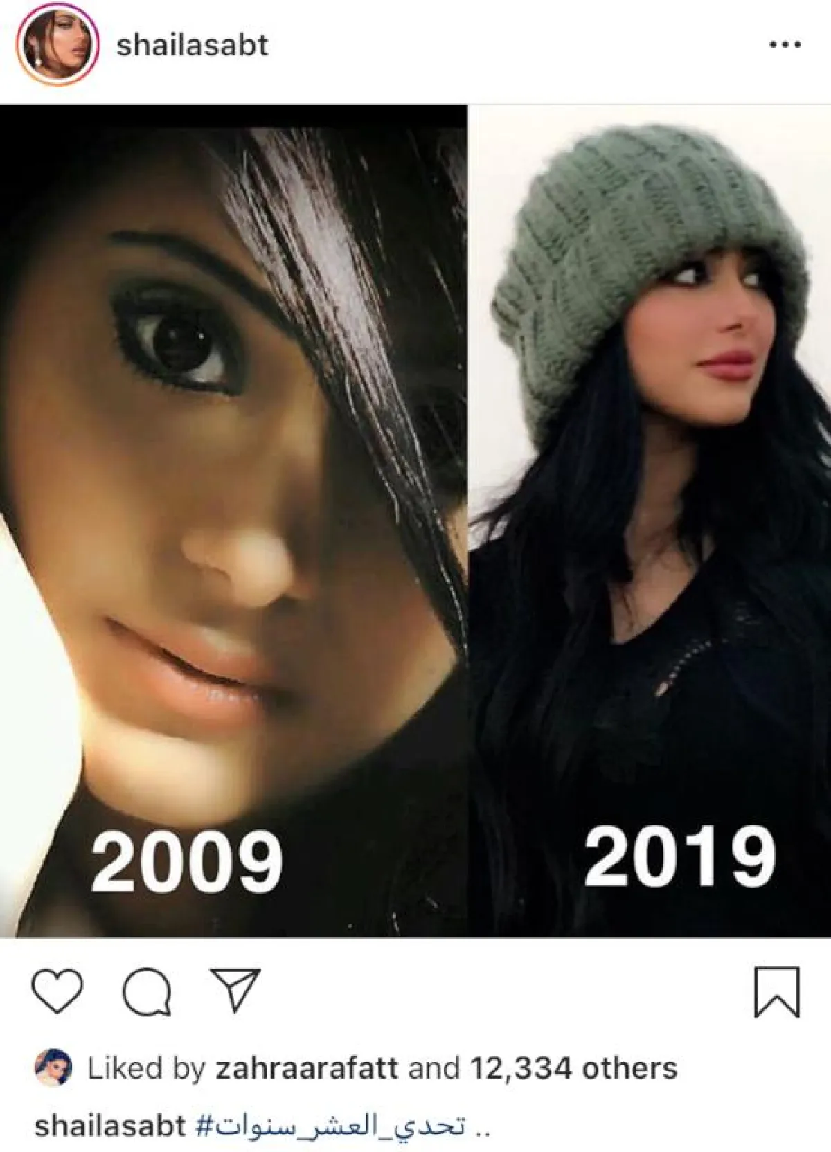 وأخيراً، وضعت الفنانة شيلاء سبت صورتين لها ضمن تحدي العشر سنوات دون تعليق.