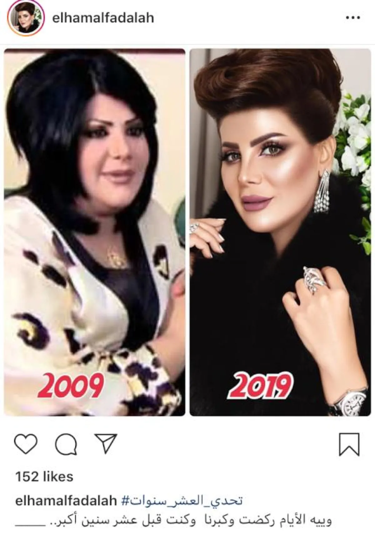 فيما نشرت الفنانة إلهام الفضالة صورتين ضمن تحدي العشر سنوات، وكتبت: "وييه الأيام تركض، وكبرنا وكنت قبل عشر سنوات أكبر". وظهر الاختلاف واضحاً بين الصورتين، فقد كان وزنها قبل عشر سنوات زائداً جداً، لكنها فقدت الكثير منه بعد العملية التي أجرتها قبل أعوام.
