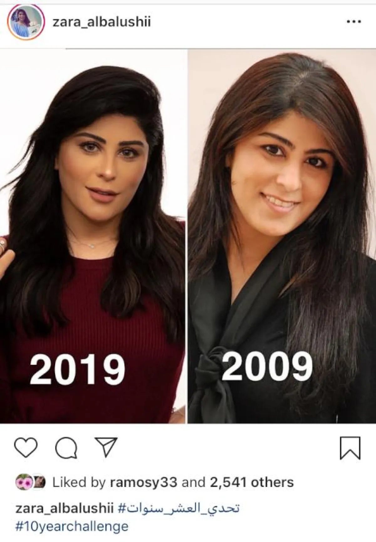واكتفت الفنانة زارا البلوشي بنشر صورتيها في تحدي العشر سنوات دون تعليق.