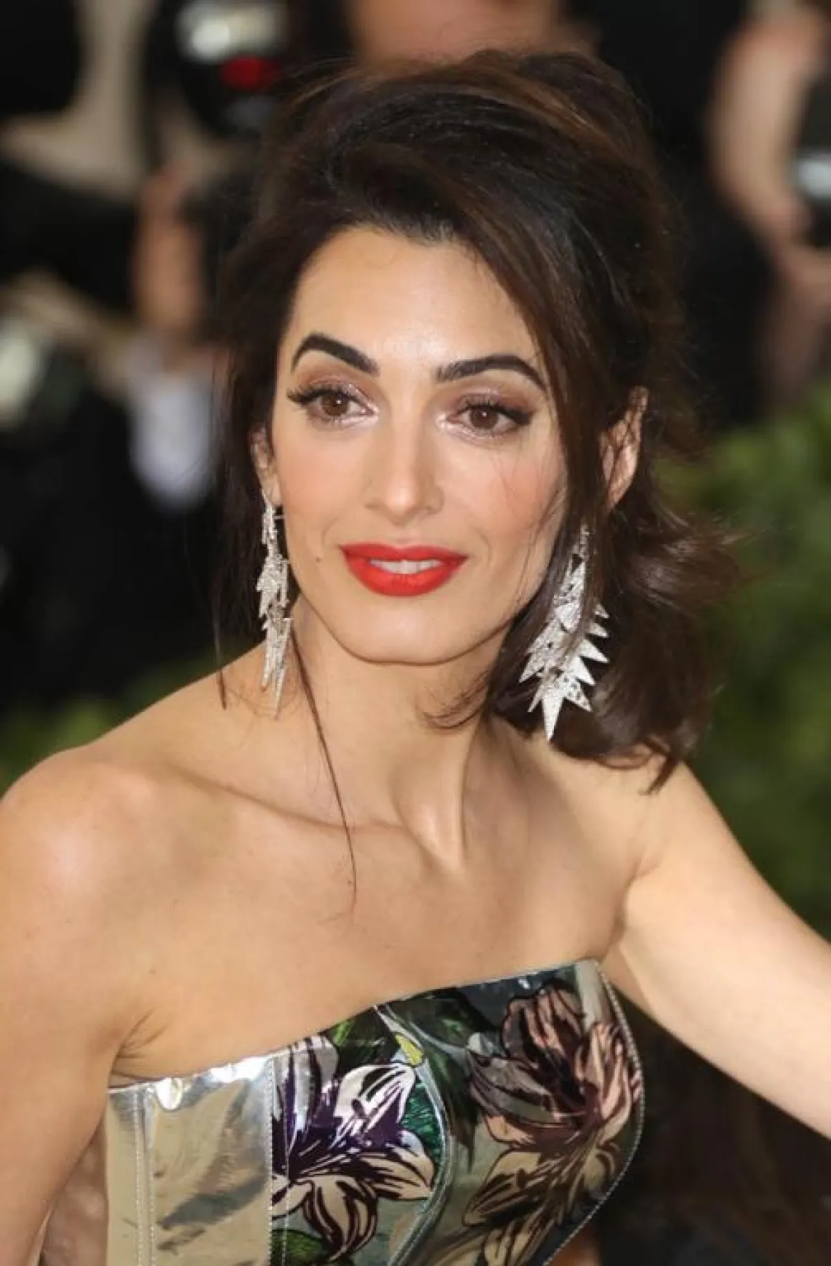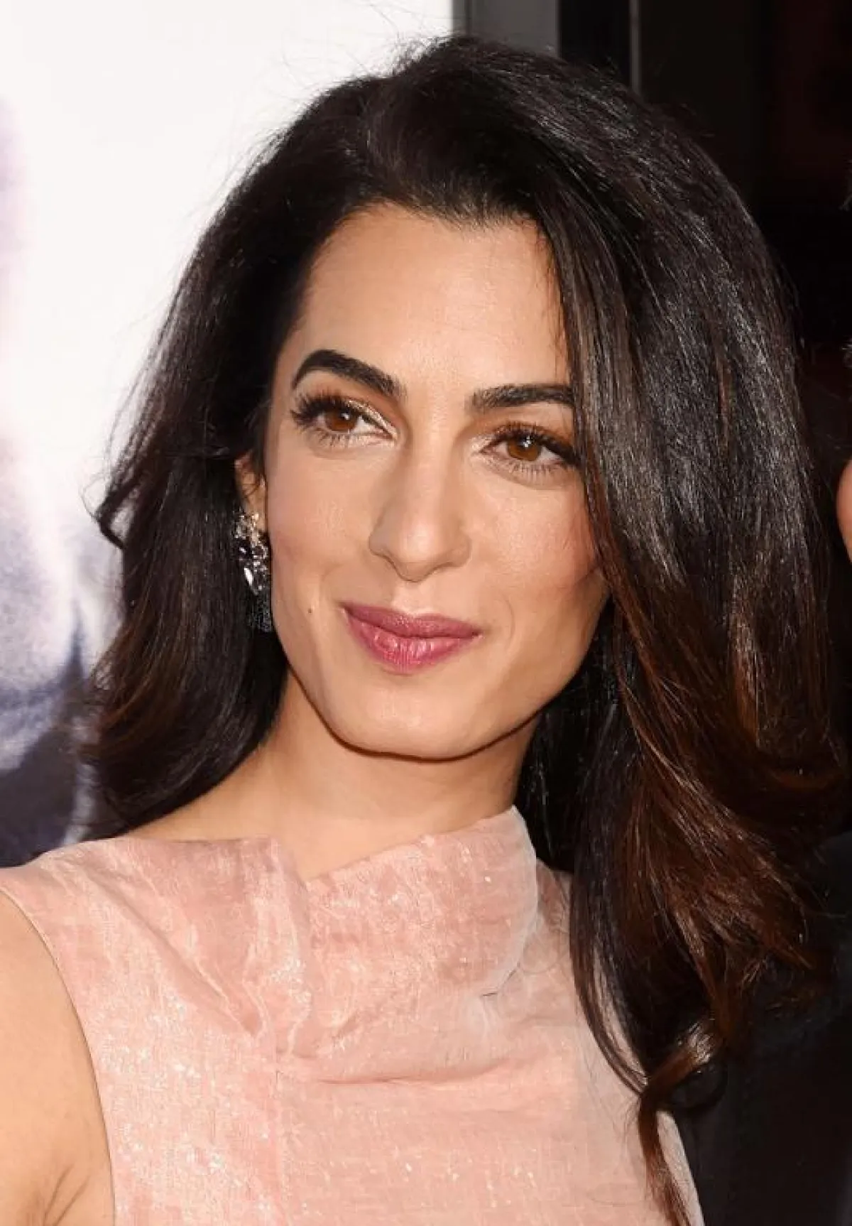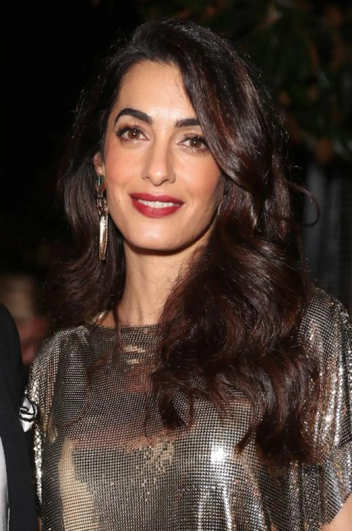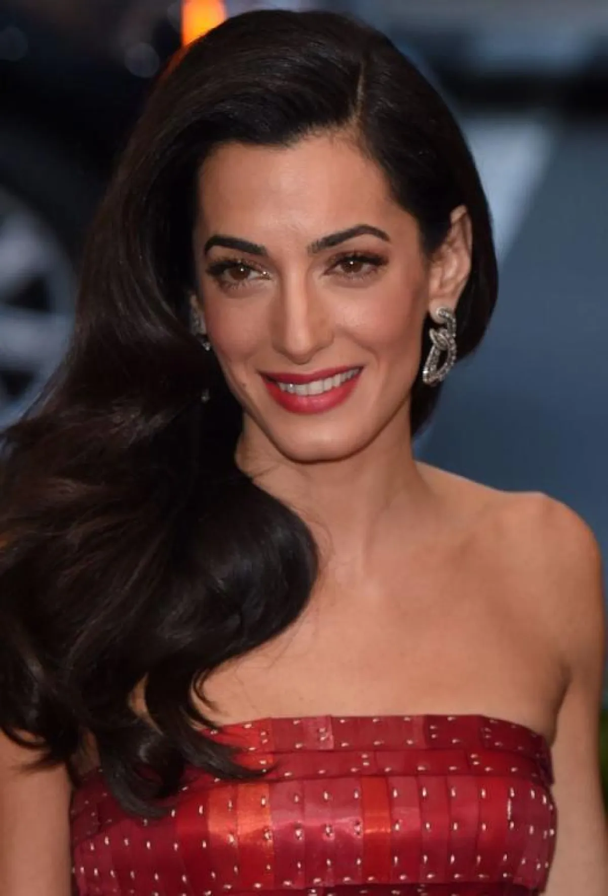 غالباً ما تختار أمل كلوني تسريحة الشعر المنسدل، مع الغرة الجانبية. فشكل وجهها الطويل والنحيل، يحتاج إلى خصلات تغطي وتمنحه مظهراً ممتلئاً بعض الشيء. كما أن الغرة التي تغطي نصف جبينها تقريباً، تساعد على التقليل من طول وجهها.
