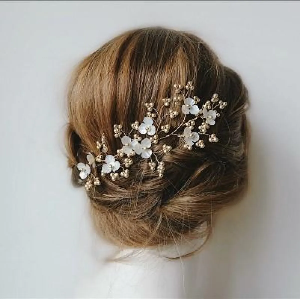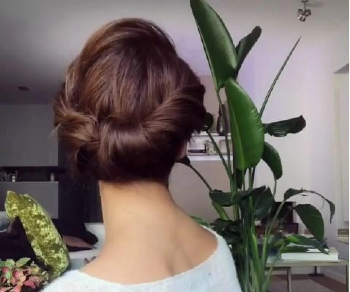 من الخلف، اقسمي الجزء المنسدل من شعركِ إلى قسمين. ارفعي أحدهما إلى أعلى وقومي بلفّه نحو الداخل ثم ثبّتيه بالدبابيس. وكرري الأمر نفسه مع القسم الثاني. وأخيرًا رشّي على شعركِ القليل من الرذاذ المثبّت.