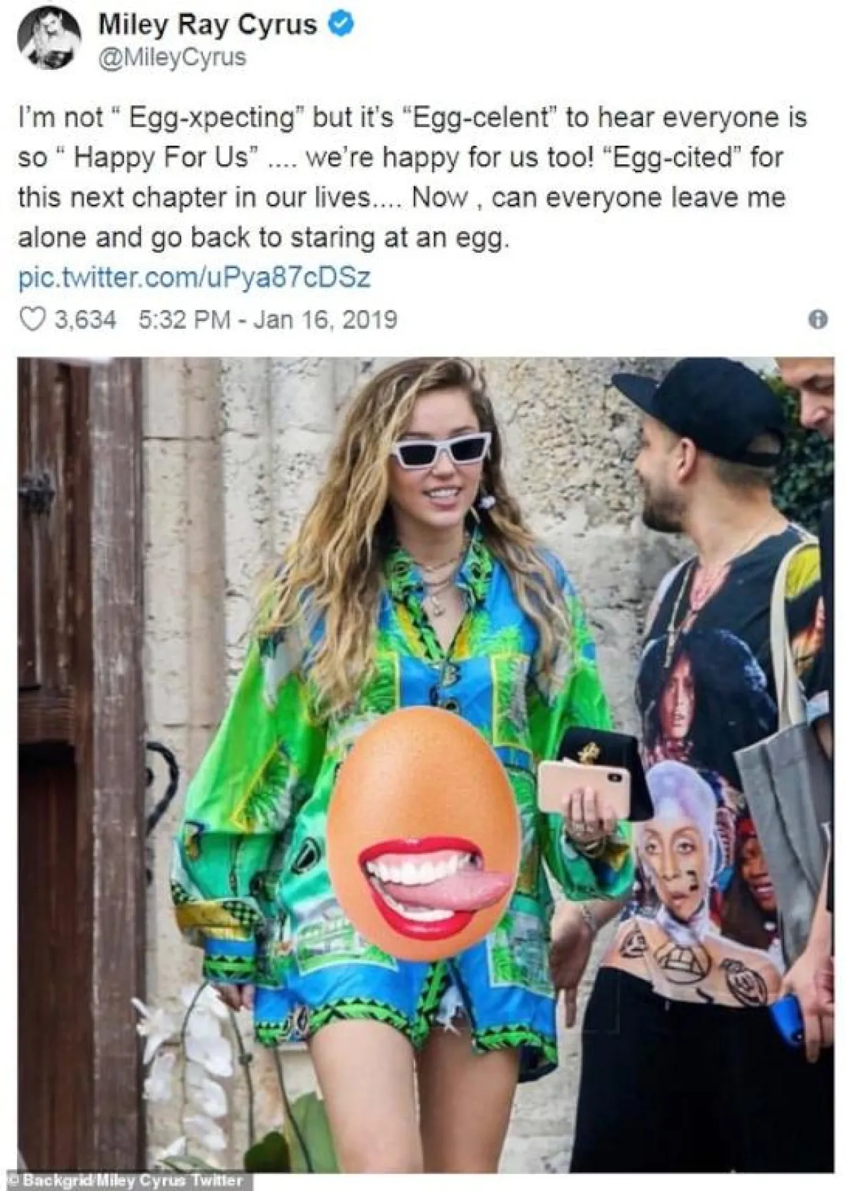 ولم تكتفِ مايلي باستخدام الصورة، بل أدخلت كلمة بيضة في كل كلمات التعليق الذي أرفقت الصورة به، حيث كتبت: "أنا لست حامل " egg-xpecting"، ولكنه أمر رائع " egg-celent" أن أعرف أنّ الجميع سعيد هكذا من أجلنا...نحن سعيدان أيضًا، ومتحمّسان "Egg-cited" للمرحلة الجديدة من حياتنا..ولكن في الوقت الحالي دعونا في شأننا، وعودوا لمشاهدة البيضة".