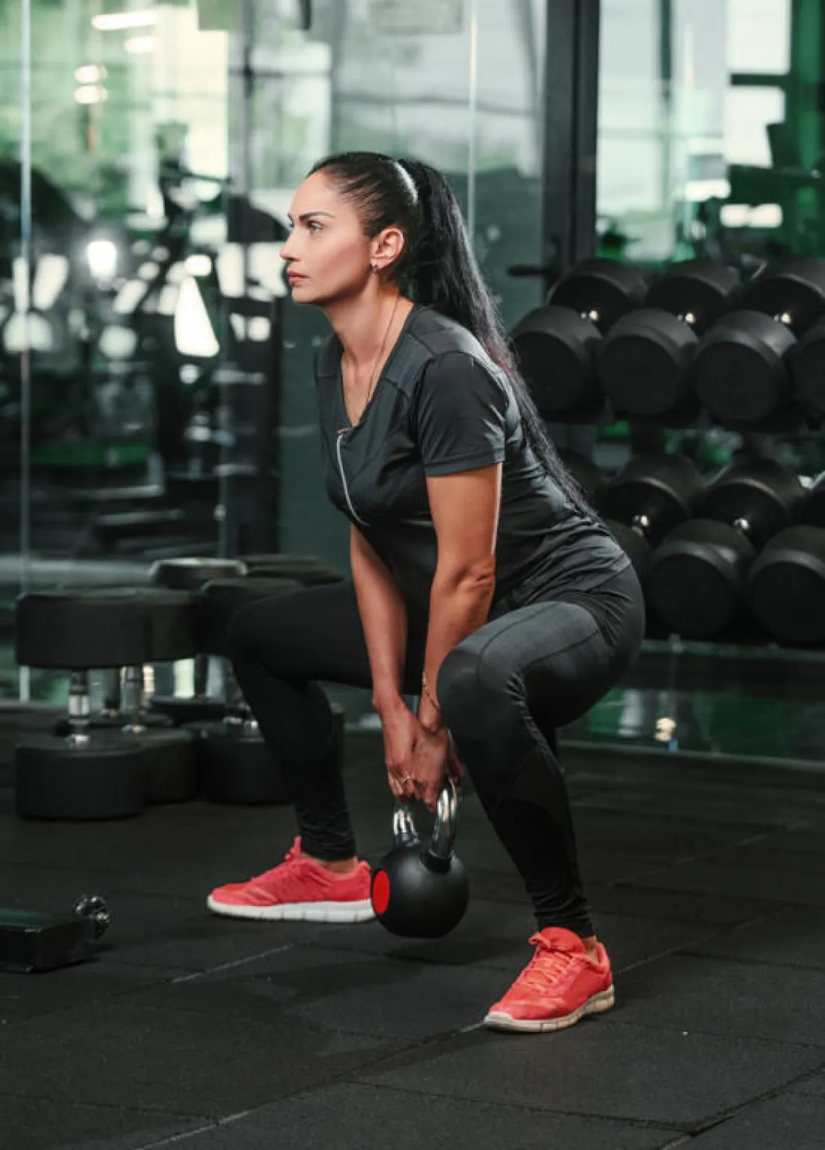 6. تُمسك كرة الوزن باليدين، مع إرجاع الحوض إلى الوراء، أثناء النزول والنهوض إلى الأرض.