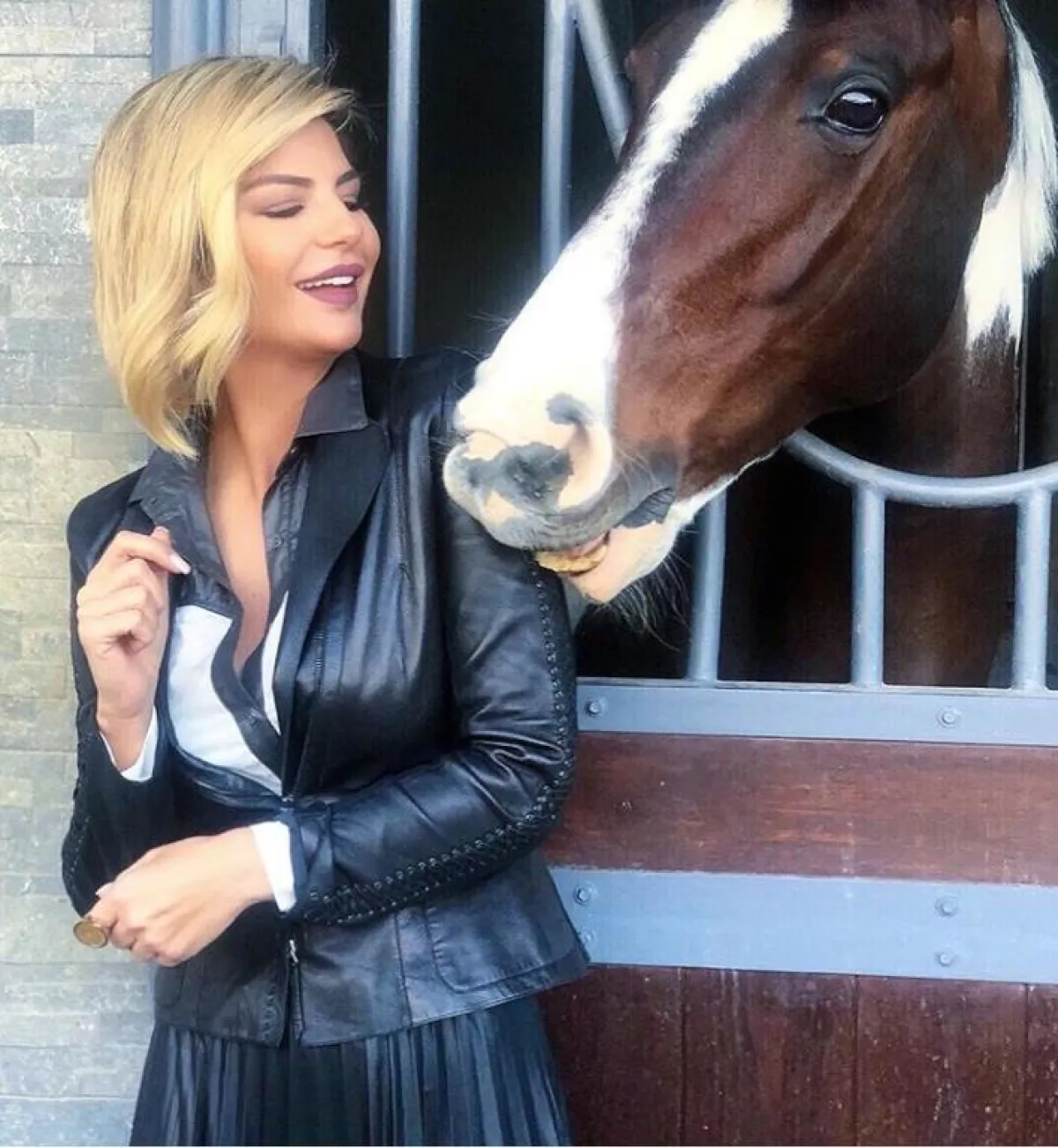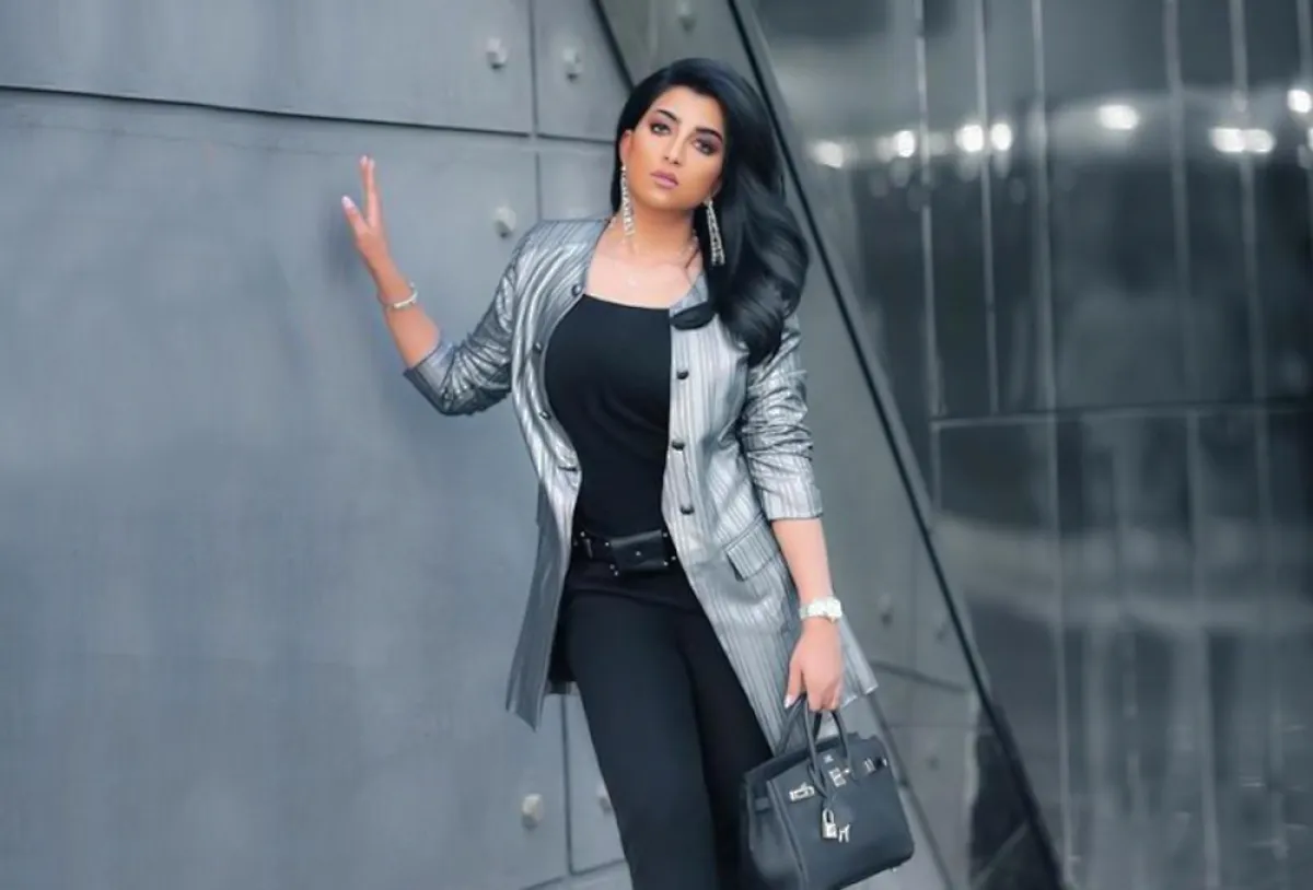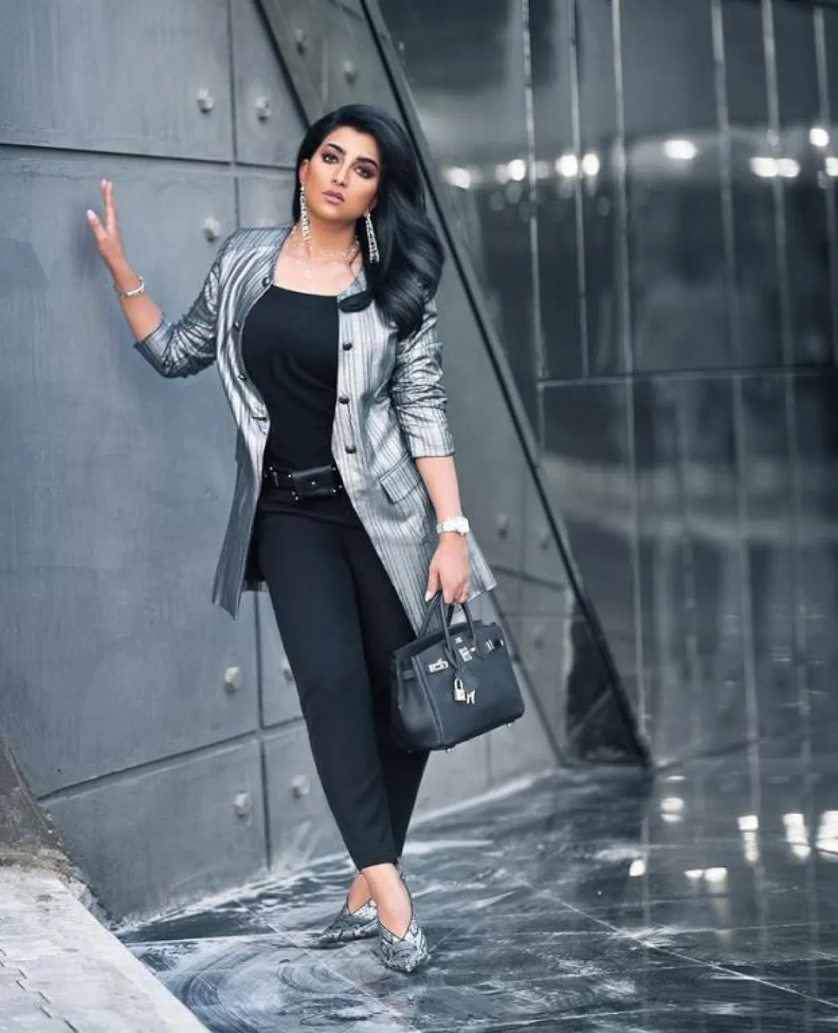 في المقابل اختارت الفنانة بثينة الرئيسي هذه الصيحة فاختارت الجاكيت اللامع الفضي، مع توب وبنطلون أسود، ونسقت معه حذاءً بجلد الثعبان الفخم، لاطلالة مترفة.