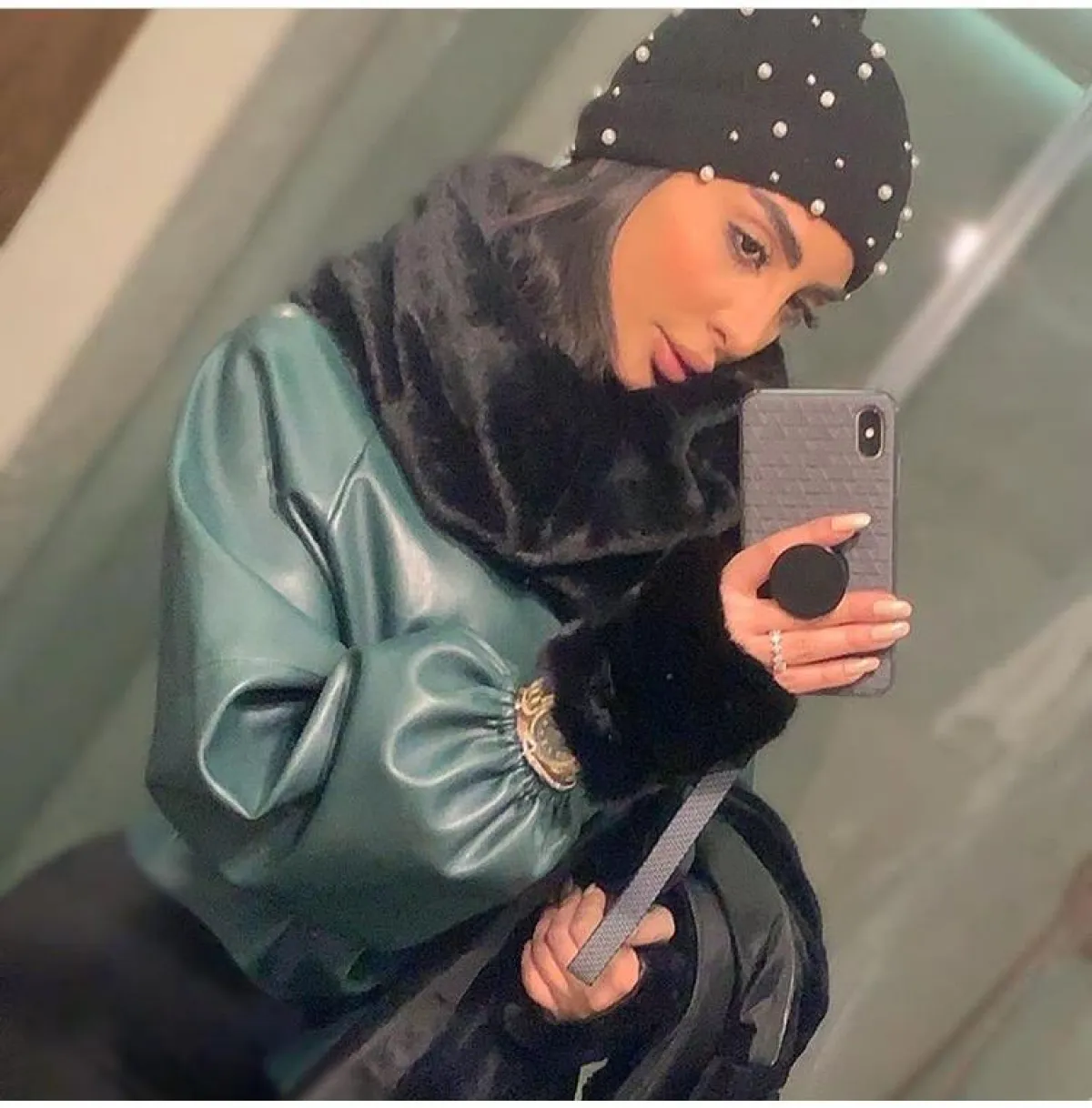 لفتنا كذلك الجاكيت باللون الفيروزي الأخضر، مع أكمام وياقة الفرو التي اعتمدتها الفنانة نور الغندور، نسقت معها الآيس كاب الفرو مع أحجار اللؤلؤ التي أضافت لمسة كلاسيكية للّوك.
