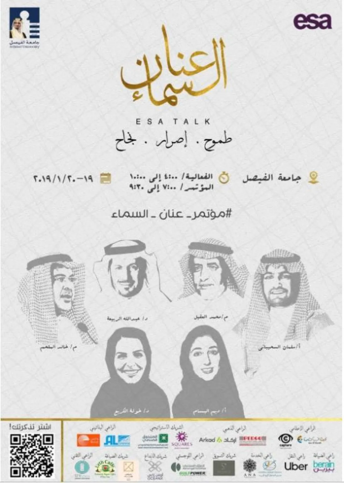 بمشاركة المستشار في الديوان الملكي المشرف العام على مركز الملك سلمان للإغاثة والأعمال الإنسانية الدكتور عبد الله الربيعة، والمهندس خالد الملحم، والدكتورة خولة كريع، والمهندس محمد العقيل، وسلمان السحيباني، وديم البسام، تحتضن اليوم وغدًا (19-20 يناير 2019) جامعةُ الفيصل في ربوع العاصمة السعودية الرياض فعاليةَ "عنان السماء"، التي تحمل شعارَ "طموح، إصرار، نجاح"، والتي تجمع نماذج فعالة ومؤثِّرة من كبار الشخصيات المميزة في عدة مجالات، وسيتحدثون عن قصص نجاحهم، والطريقة التي حقَّقوا من خلالها أهدافهم وأحلامهم؛ ليستفيد الطلاب والحضور منهم في استثماراتهم المستقبلية، وطرقهم في ريادة الأعمال والهندسة، وكل ما يخصُّ سوق العمل.