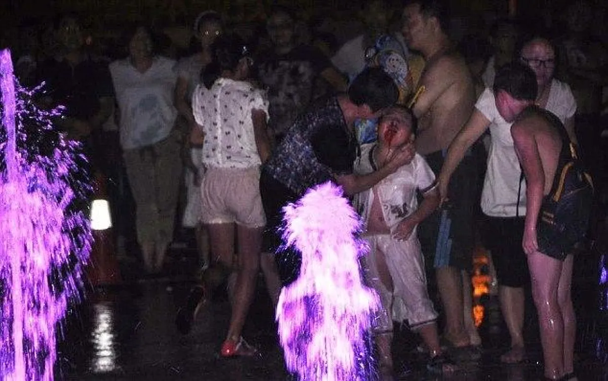 وتظهر اللقطات التي نشرتها صحيفة "دايلي ميل" البريطانية اللحظة التي رفعت فيها النافورة الطفل في الهواء، وأسقطته أرضًا مصابًا بجروح في جسده ونزيف في أنفه، وسارع الوالدان إلى احتضانه للتخفيف من صدمته النفسية قبل تطبيب جروحه ونقله إلى المستشفى وسط ذهول المحتشدين. فيما تمزقت ملابس الطفل ذي الأعوام الخمسة بسبب شدة ضغط مياه النافورة الموجودة في إحدى المتنزهات العائلية بمقاطعة هوبي الصينية. وقد استهجن والد الطفل "وان لو" عدم وجود لافتات بجانب النوافير المستديرة تحذر من خطورتها عند اقتراب الأطفال بجانبها، مشيرًا إلى أنّ صرخات ابنه فرحاً تحولت إلى صرخات خوف وفزع عندما طار فجأة في الهواء.