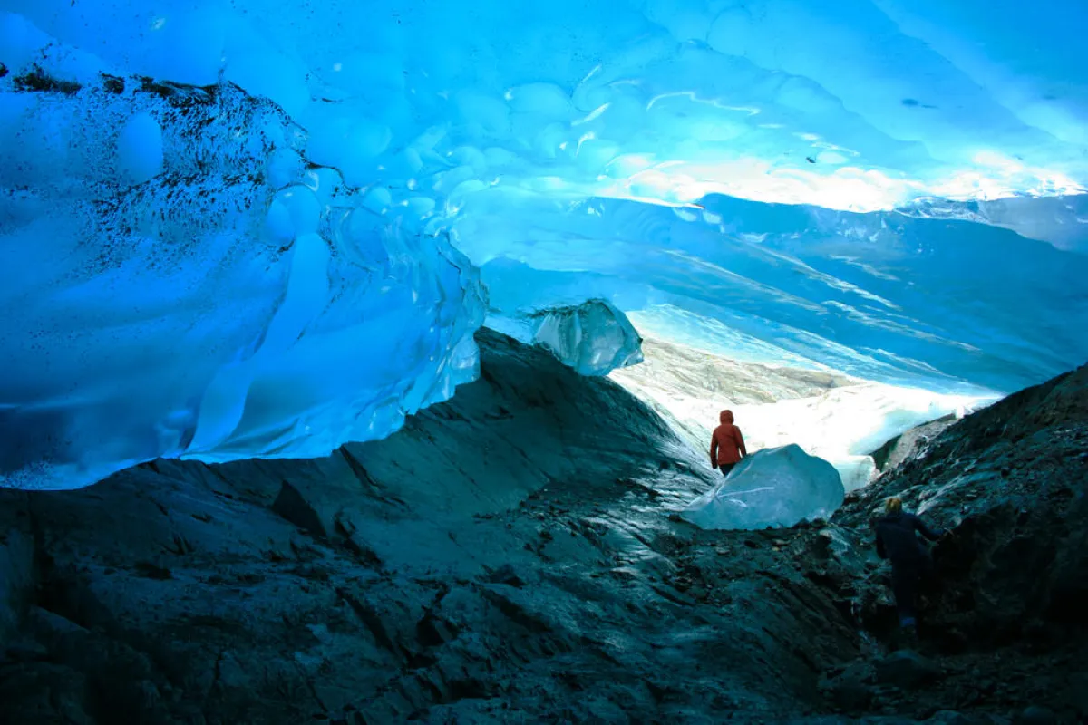 لا يمكن لأصحاب القلوب الضعيفة الوصول إلى الكهوف الجليدية داخل جبل مندنهال الجليدي في جونو بسهولة، بل يجب على المغامرين أن يجولوا أوَّلًا في الجبل الجليدي، ثمَّ عليهم أن يتسلقوا الجليد للوصول إليها.