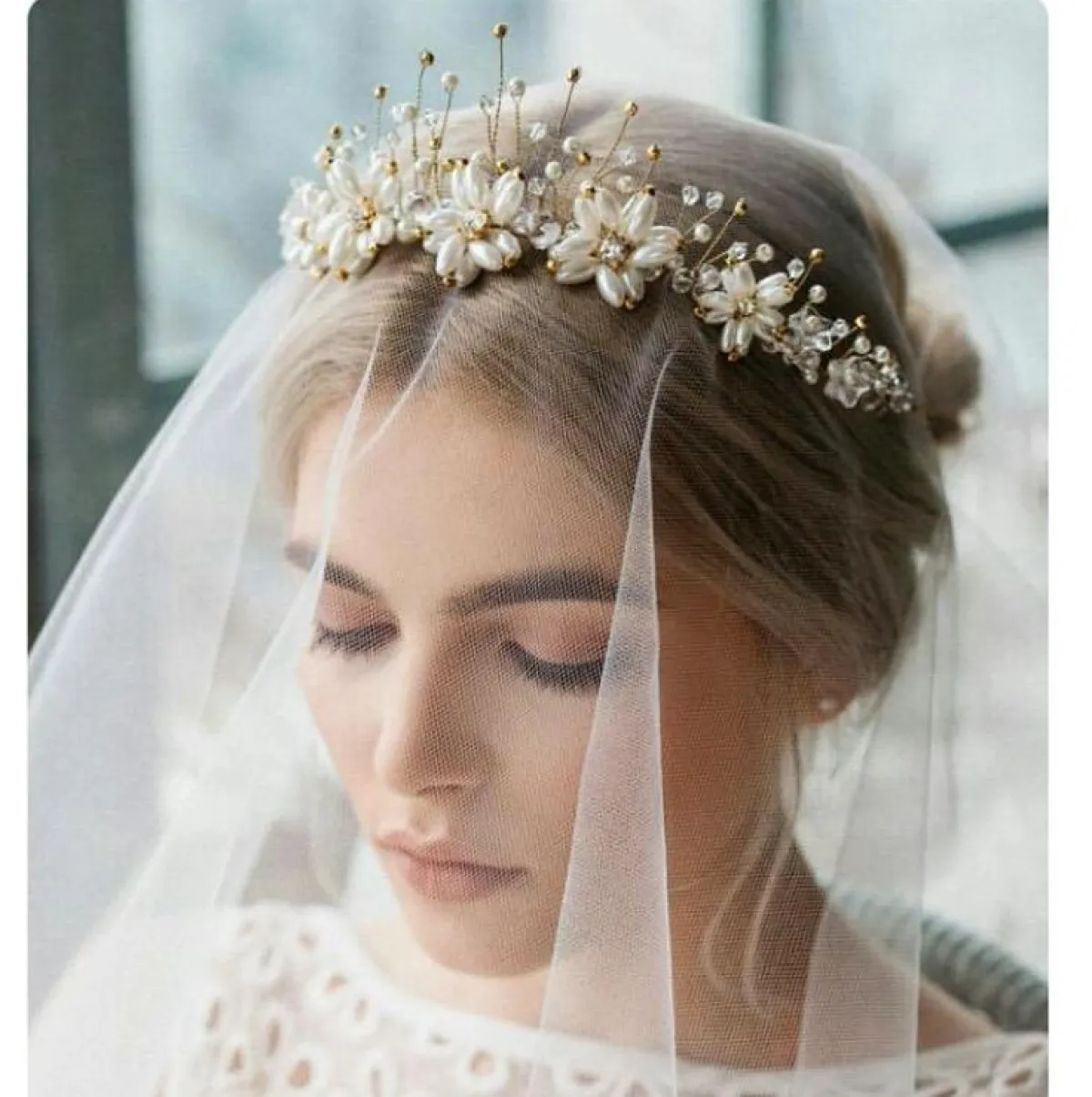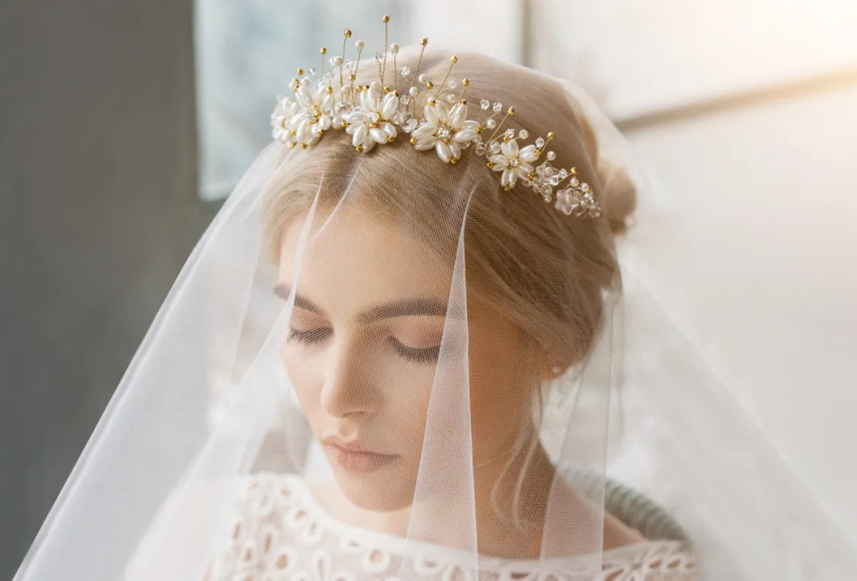 أو بإمكنكِ تنسيق أحجار اللؤلؤ العاجي باللون الكريمي، للتناسب أكثر مع لون الفستان والتاج الذهبي، كالتاج بأحجار اللؤلؤ المسحوبة بشكل قطرات الماء، مرصع على شكل ورود أنيقة، تمنحكِ اطلالة مخملية بخاصة مع خصلات شعركِ الذهبية، وتناسب أكثر فستانكِ المطرز بالدانتيل مع بعض أحجار اللؤلؤ.