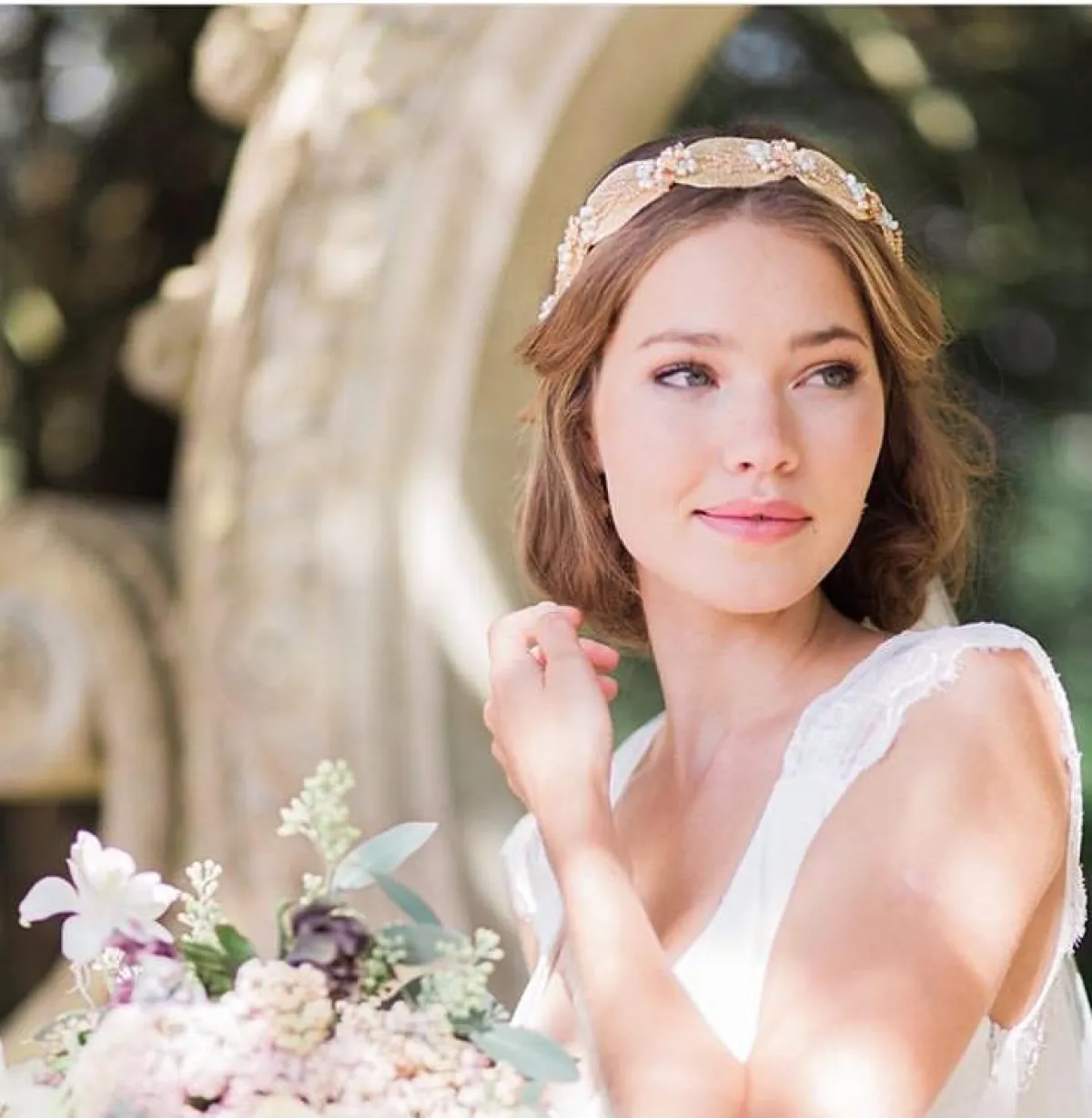 لفتنا كذلك التاج الذهبي مع لمسة الروز للعروس المخملية، التي تميل أكثر إلى الأجواء الخيالية الحالمة، وتختار فستان زفافها بسيطًا وهادئًا، يمكنكِ اعتماد التاج المطرز البسيط من دون كثير من التفاصيل.