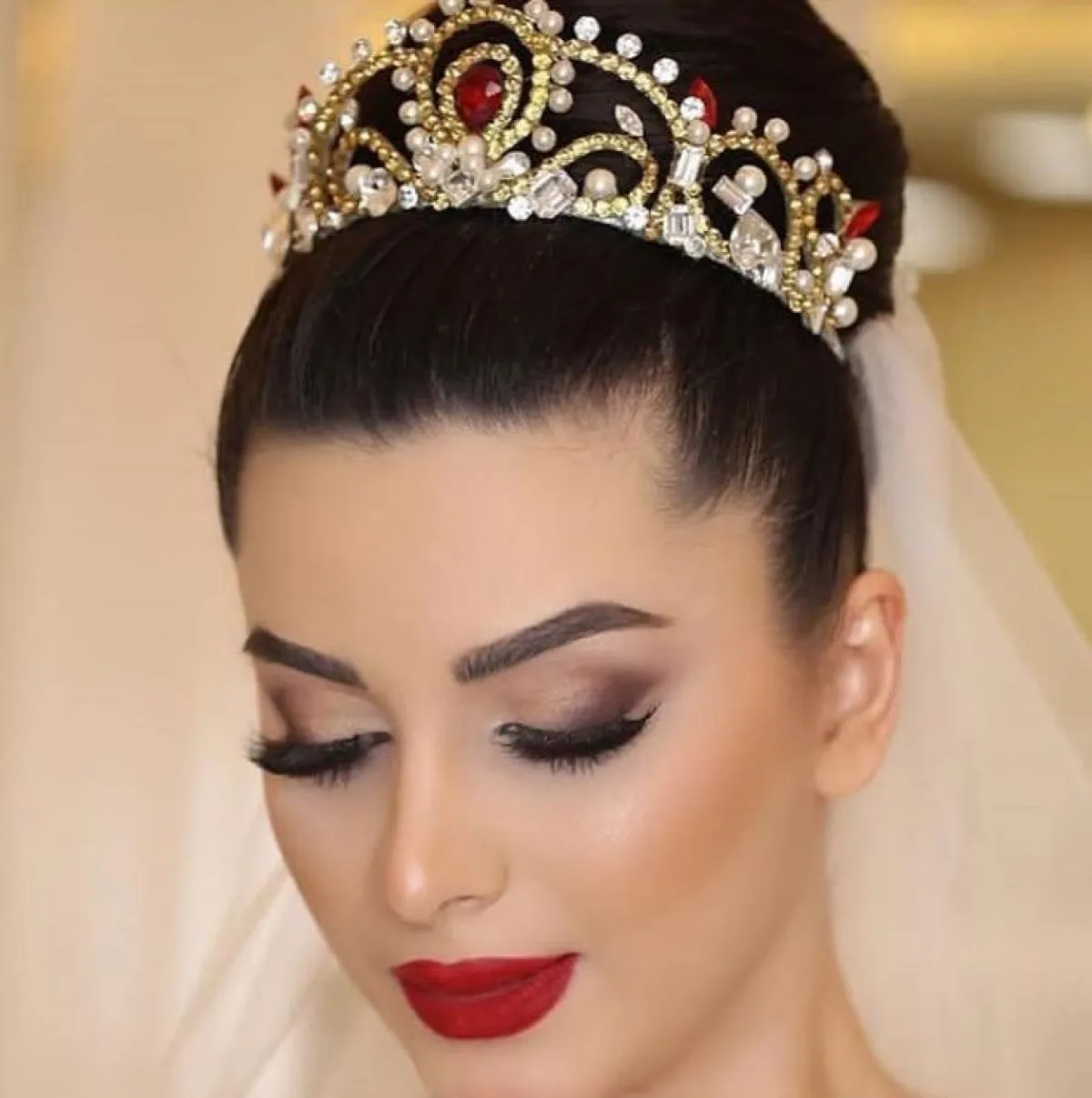 إدخال ألوان أخرى مع التاج الذهبي سيجعلكِ لافتة للأنظار، كالتاج المرصع ببعض الأحجار كبيرة الحجم باللون الأحمر، بالإضافة إلى اللؤلؤ العاجي، مستوحى أكثر من الطراز الهندي، إن كنتِ تميلين لهذه الأجواء، بخاصة مع صاحبات الشعر الأسود.