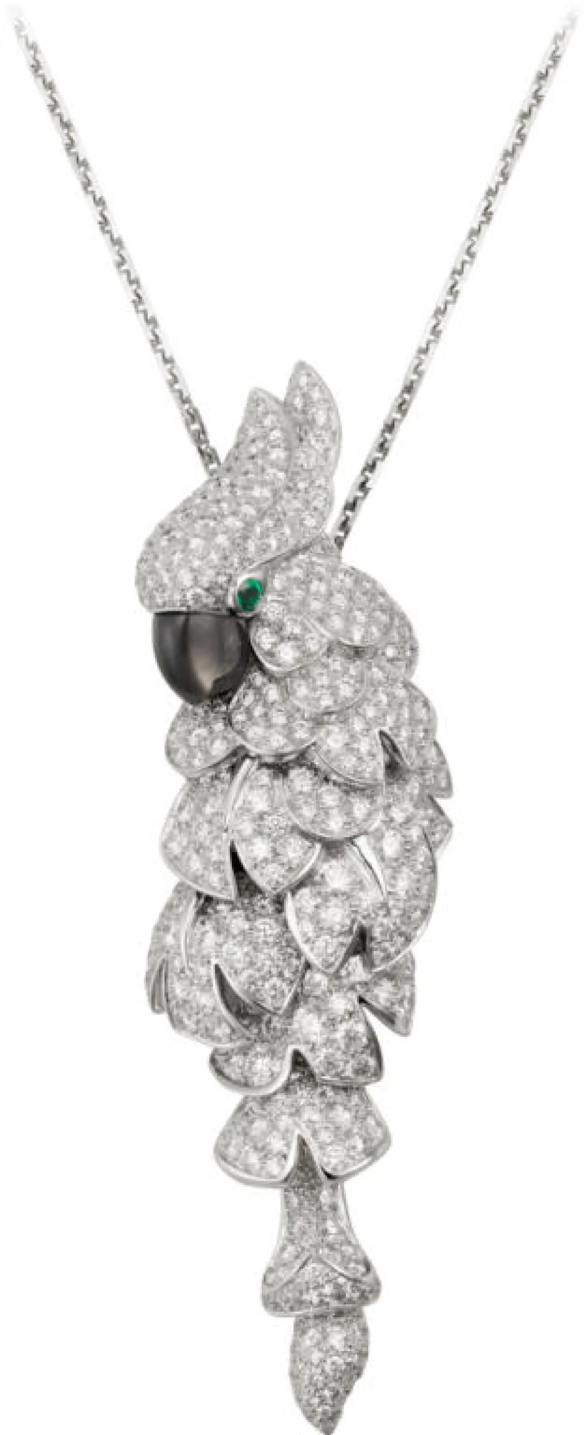 ولإطلالة جريئة ولافتة وخيار فريد، ننصحك باختيار عقد Les Oiseaux Liberes من Cartier والذي جاء على شكل طير مرصّع بالكامل بالألماس مع عين من الزمرد ومنقار من عرق اللؤلؤ الأسود.