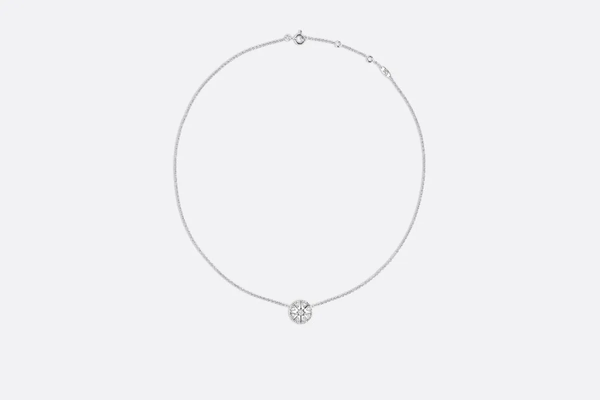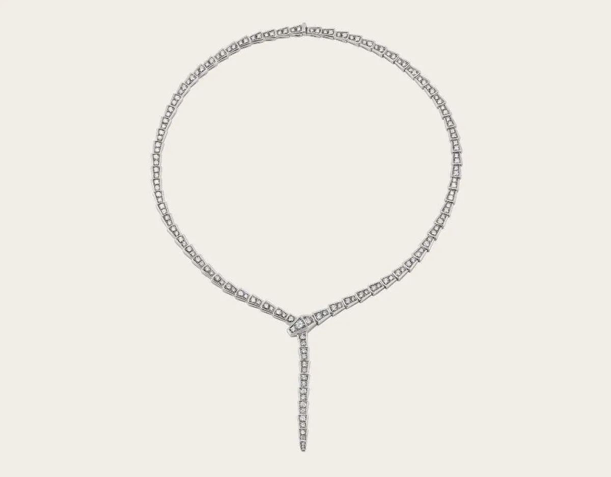 أما إذا كان فستانك بياقة مبرومة فبإمكانك أن تختاري عقد Puzzle من Akillis فهو أشبه بتصميم عقود التشوكر، يلتف على رقبتك ويضيء إطلالتك بأحجار الألماس التي رصّعته بالكامل.