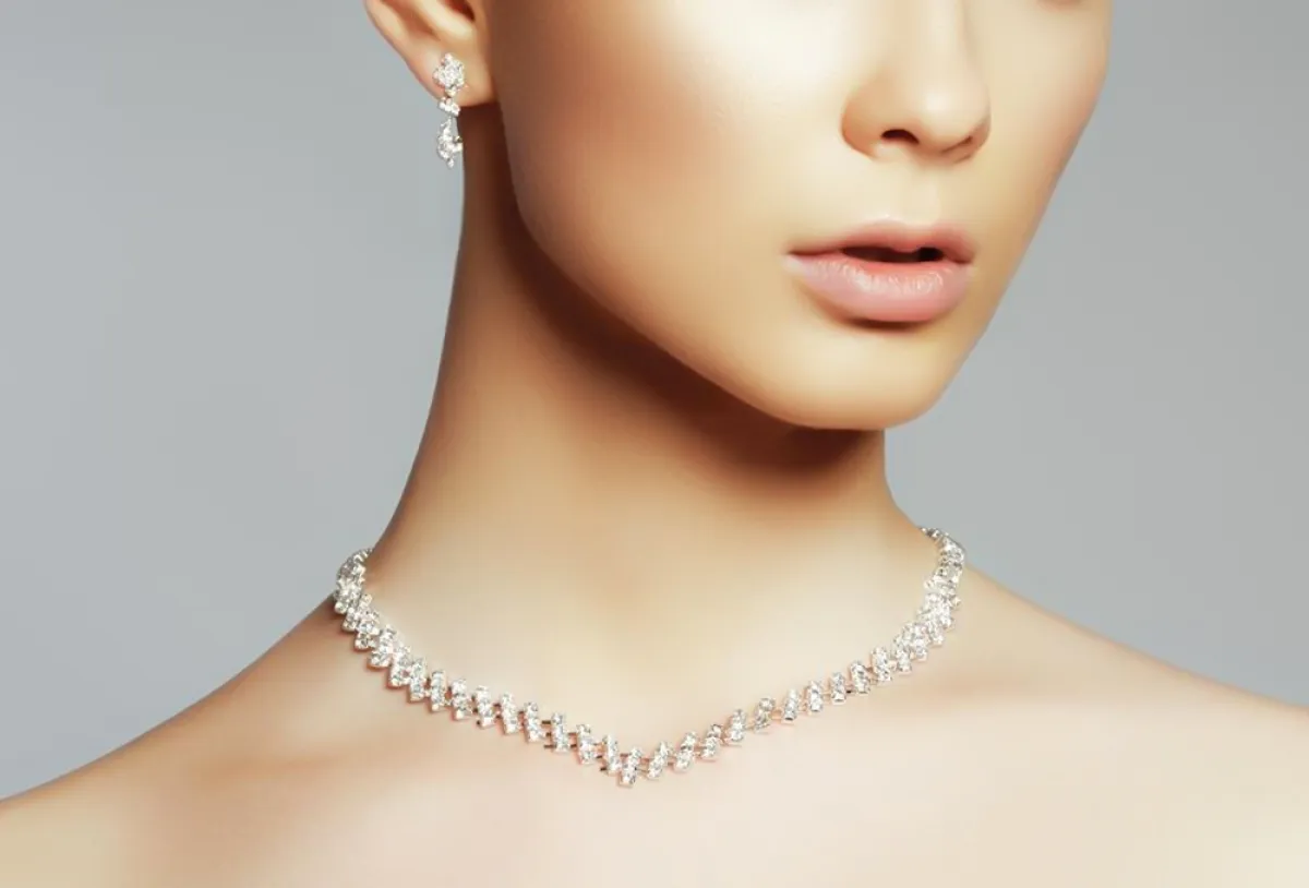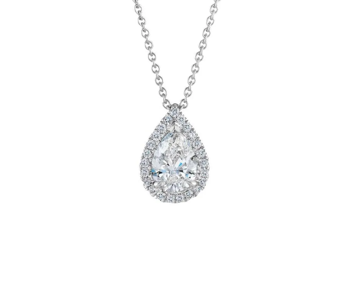 بإمكانك أن تختاري عقد الألماس لتزيّني به إطلالتك في السهرات، اختاري التصميم الذي يليق بياقة فستانك، فإذا كان فستانك على سبيل المثال يتميز بياقة على شكل V بإمكانك أن تختاري عقد Aura Pear من De Beers المصنوع من الذهب الابيض والمرصّع بأحجار ألماس صغيرة مع حجر كبير على شكل إجاصة.