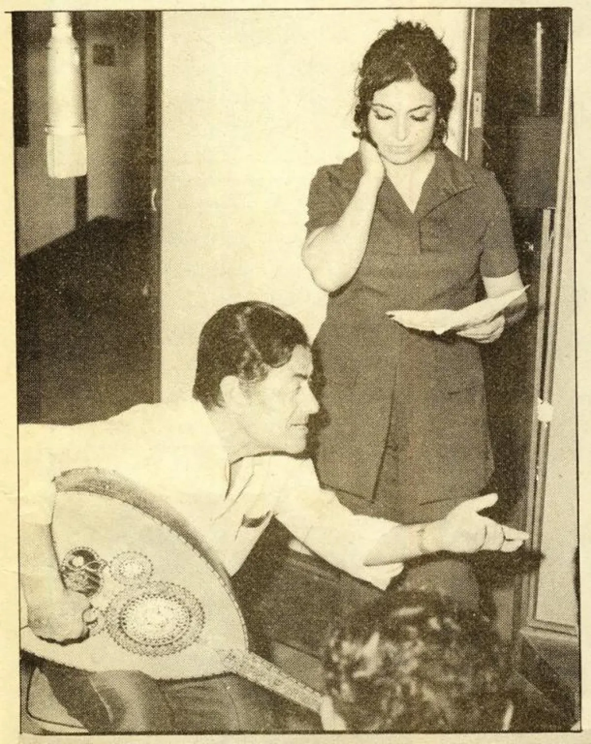 أما الصّورة الثانية مع الموسيقار فريد الأطرش أثناء بروفات إحدى الأغاني التي لحّنها لها.