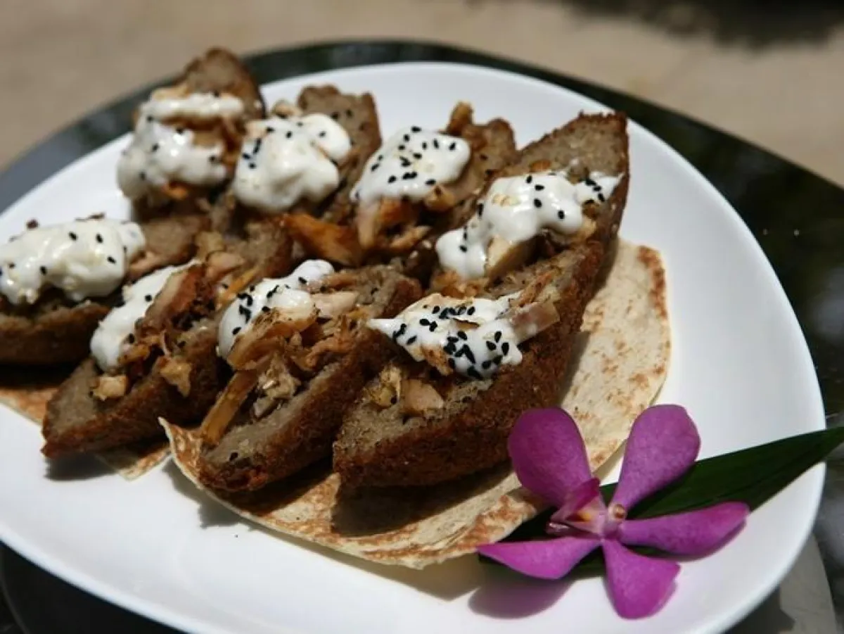 6- تزال من الفرن وتقسم الى قسمين وتحشى بحشوة الشاورما وتزيّن بجبنة الشلل.