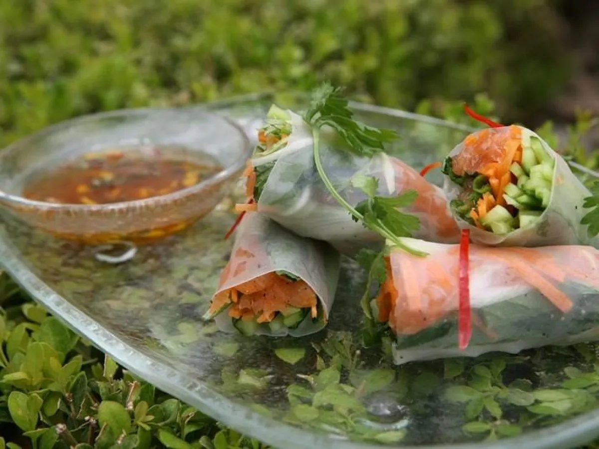 1-تُنقع ورقة أرز واحدة في وعاء متوسّط الحجم، يحتوي على الماء المغلي، حتى تصبح طريّةً. تُزال بعدها من الماء بهدوء وتوضع على مساحة مسطّحة.