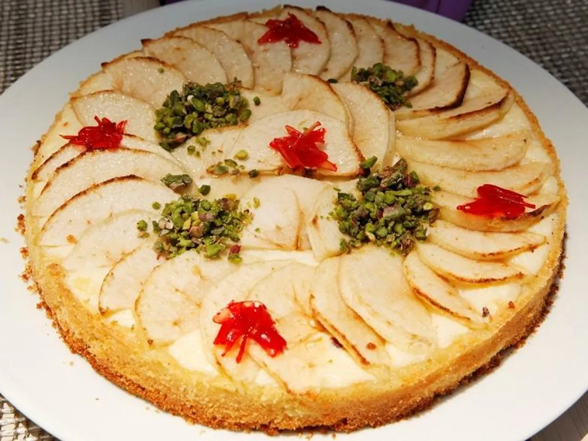 2- تمدّ العجينة في قالب الفرن ، ثم تخلط القشطة و السكر و النشاء ونضعهم فوق العجينة ، وأخيراً توضع شرائح التفاح المقطعّة.