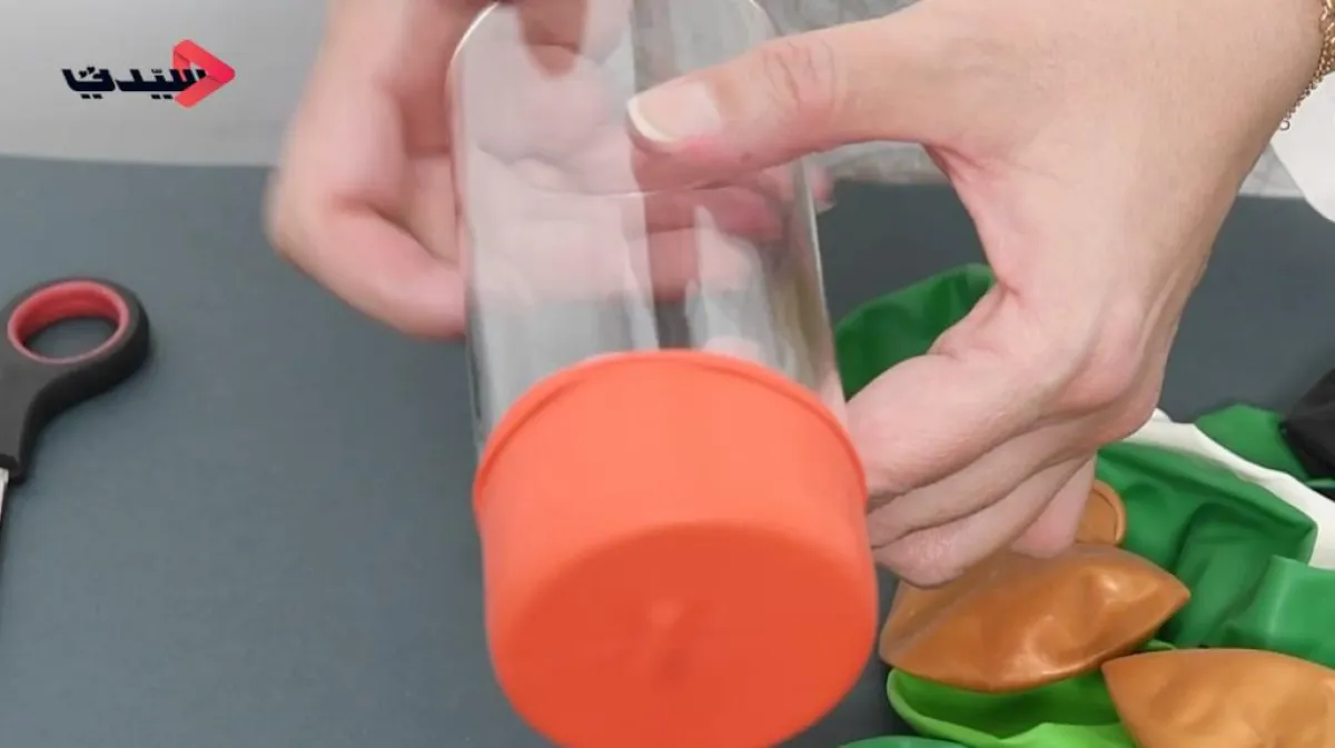 1. يُقطّع البالون إلى قطعتين، بوساطة المقصّ.