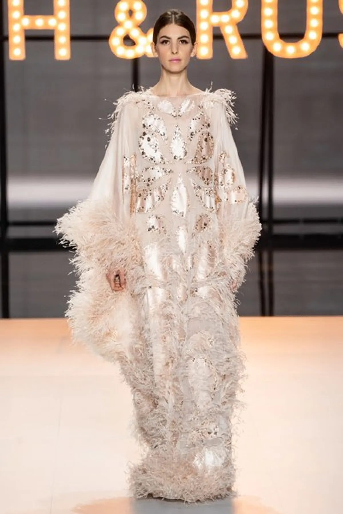 كما قدّمت علامة رالف أند روسو Raph&Russo تصاميم لفساتين ريش راقية ذات طابع موديست أو محتشم ظهر من خلال هذا الفستان شبه القفطان باللون النيود الراقي، والذي يتميّز بأكمامه الواسعة.